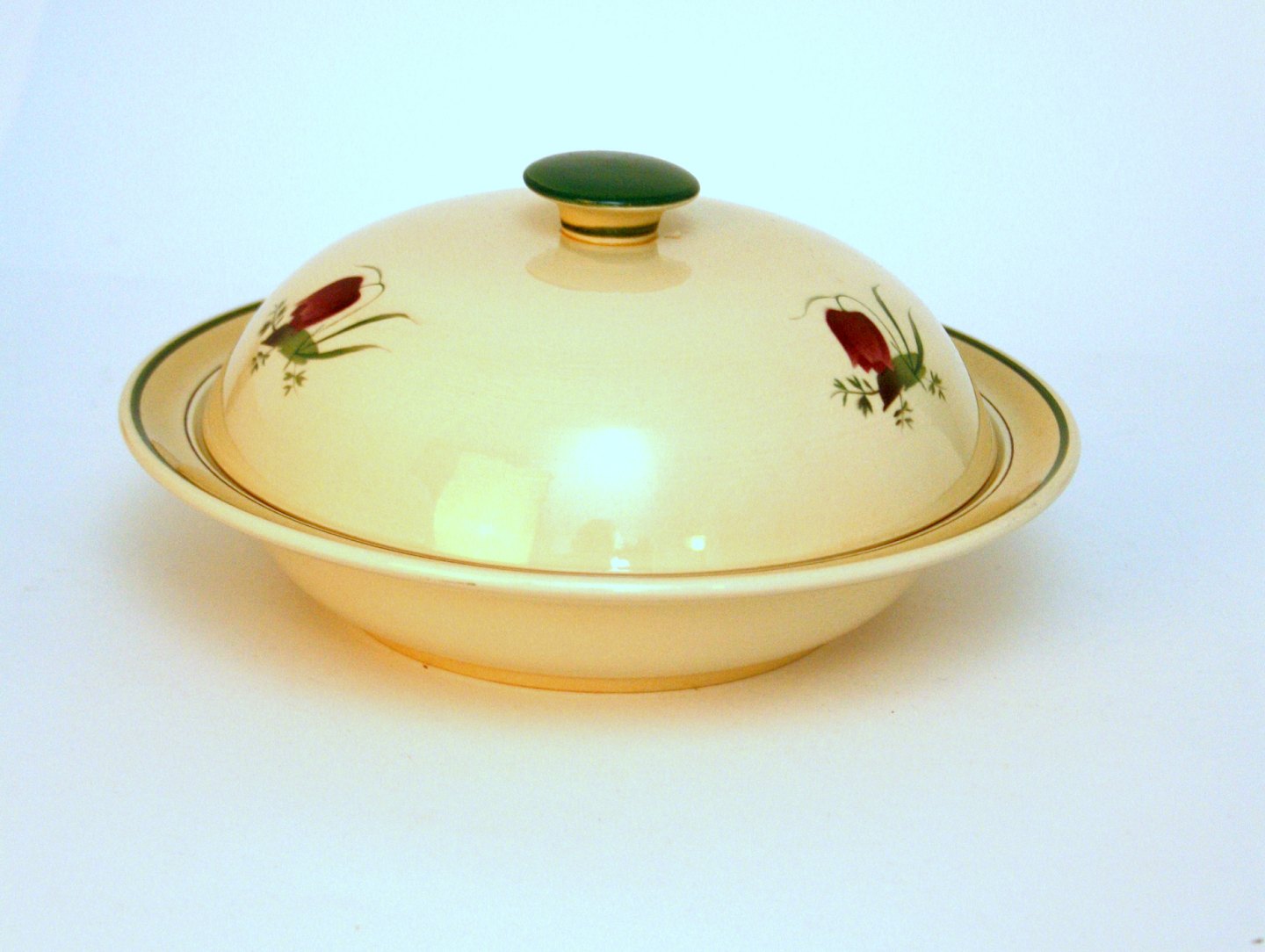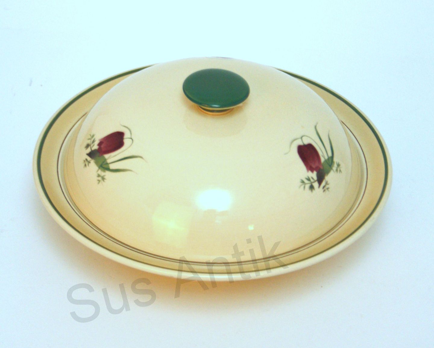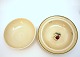 Aluminia fajance, Vibeæg. Motiv violet og grøn vibeæg blomst. Flettet kant. Formgivet af Nils Thorsson. Produceret i perioden 1934-1967. Kompotskål med låg, meget sjælden. Højde 10,5 cm. Diameter 21 cm. Flot stand meget svag misfarvning indvendig. Pris: SOLGT