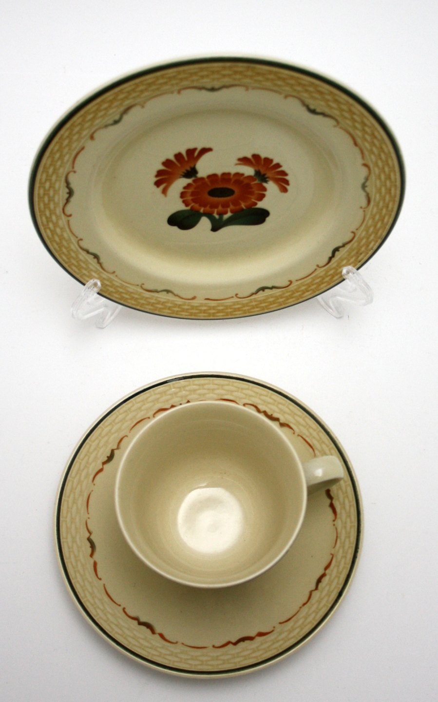 Aluminia, Morgenfrue. Designet af Niels Thorsson. Produceret i perioden 1934-1967. Luftmalet. Kaffekop. Højde 6 cm. Diameter 7,5 cm. Underkop diameter 13,5 cm. Pris: SOLGT Kagetallerken. Diameter 16 cm. Flot stand. Pris: SOLGT
