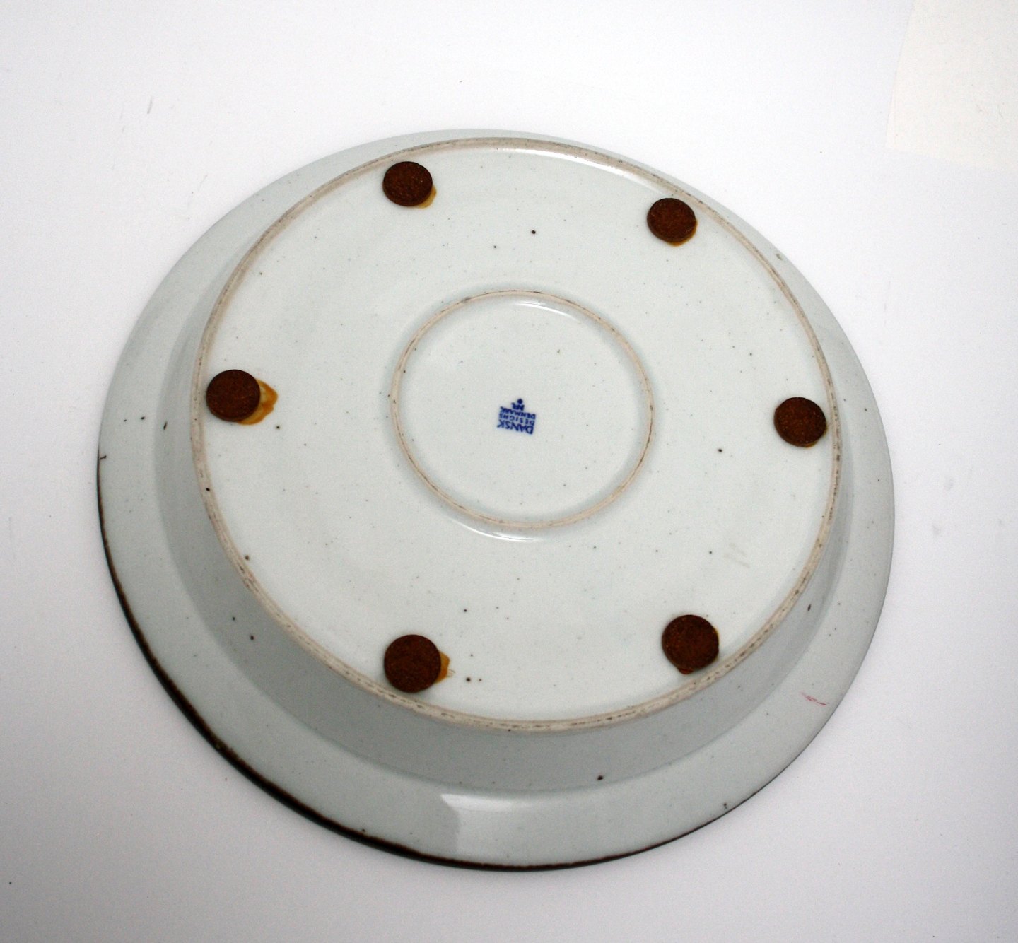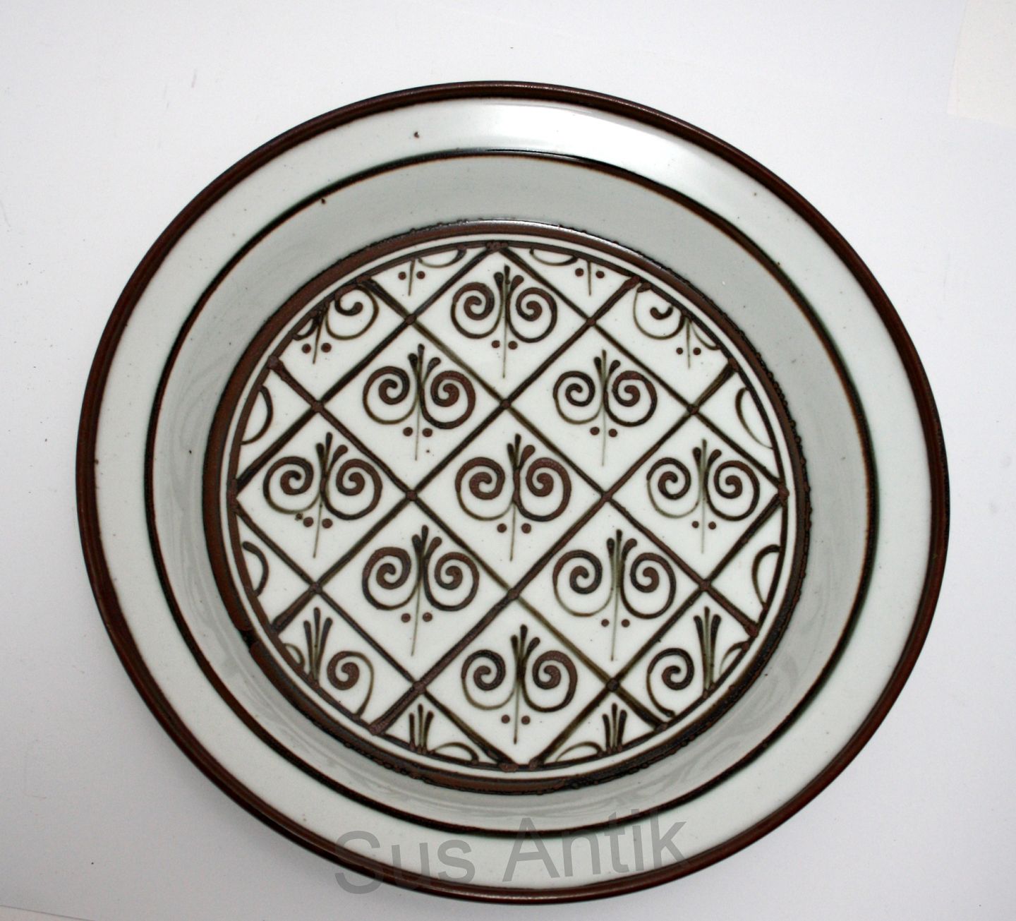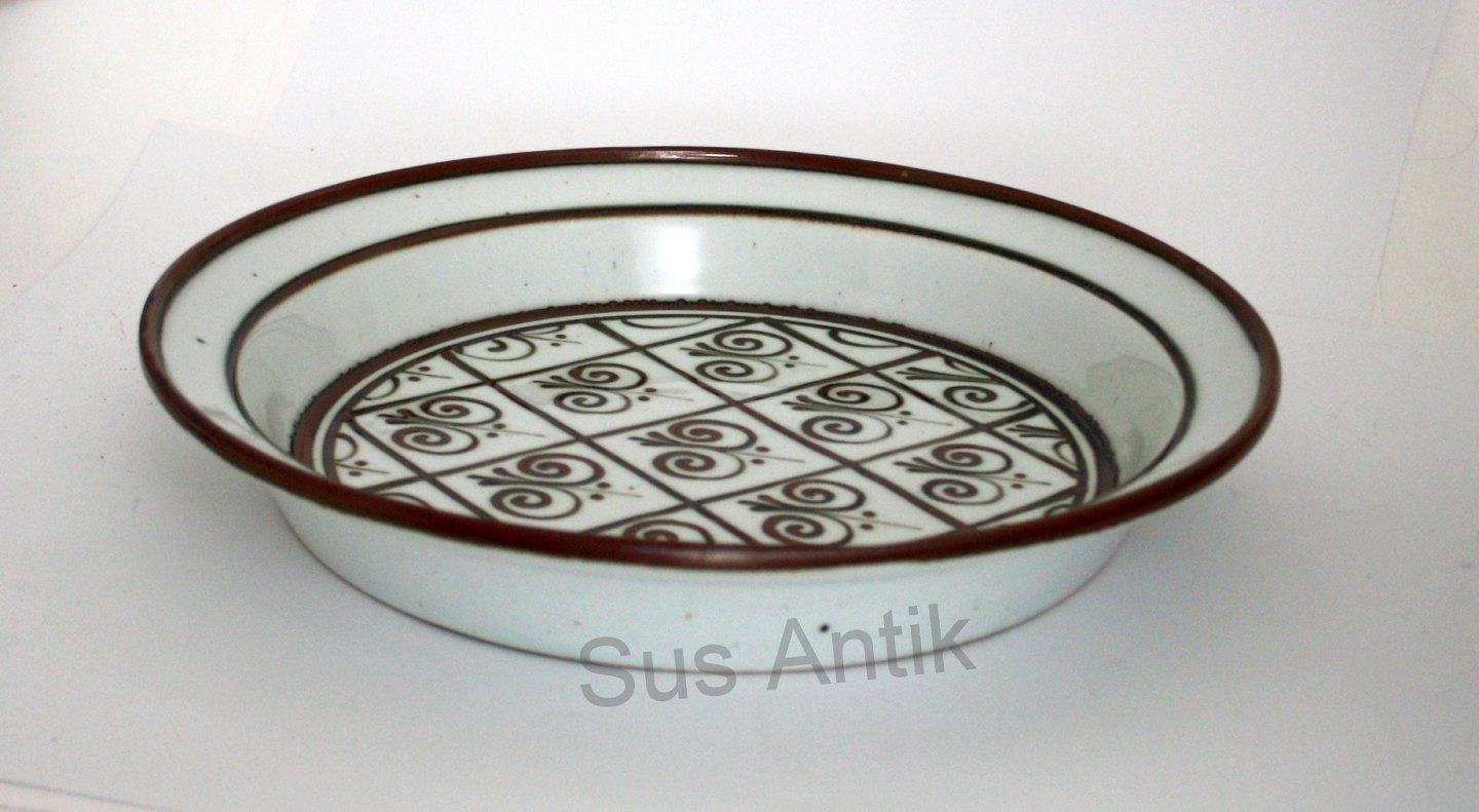 Eslau, DANSK designs Denmark, Stort dybt hvidglaseret fad med brunt mønster og mørke jernpletter. Designet af Niels Refsgaard. Diameter 33 cm. Højde 5,5 cm. Fremstillet i 1960'erne. Stempel Dansk Designs Denmark, NR. II. sortering. Pris: SOLGT