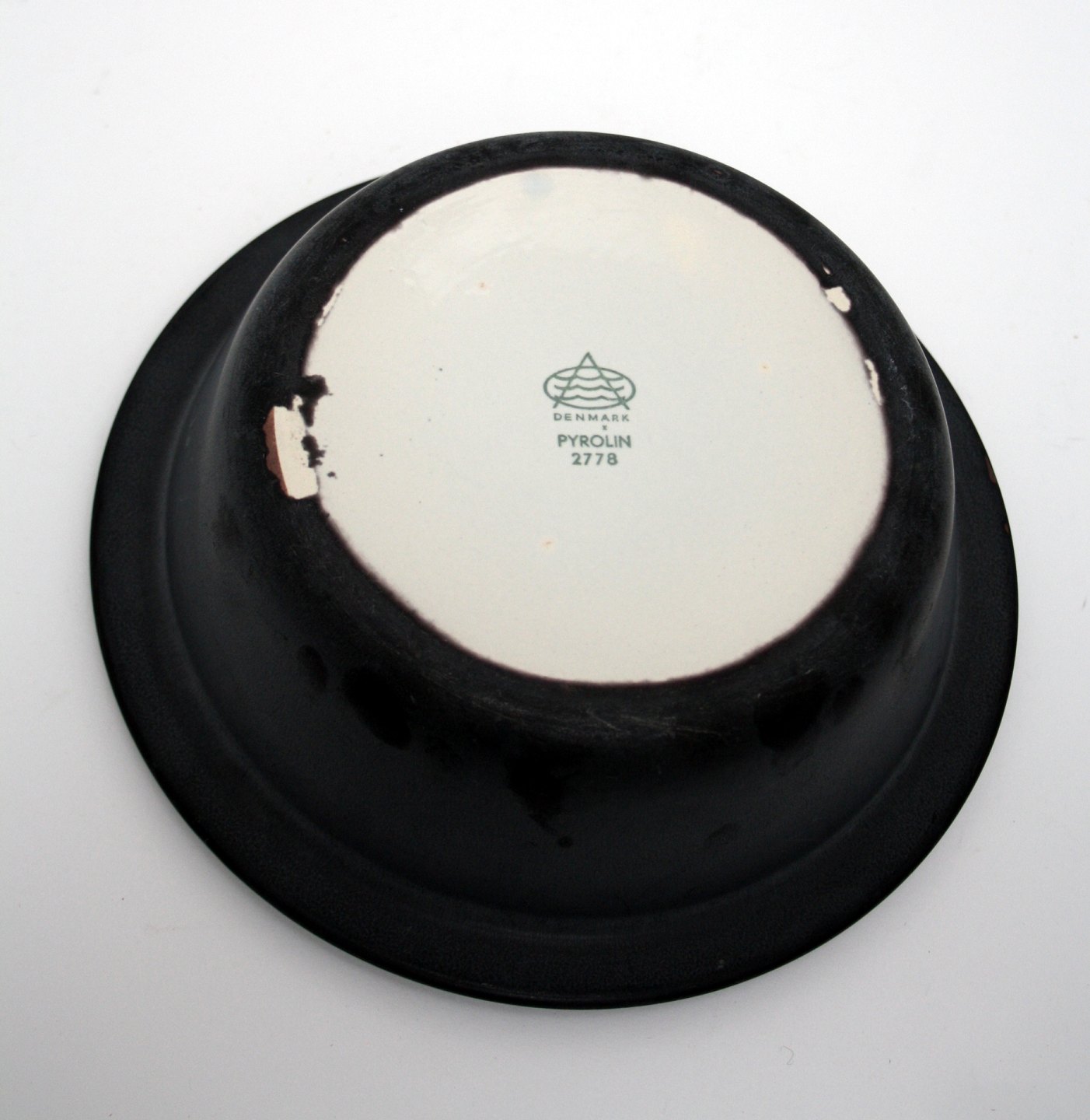 Aluminia, Pyrolin, Skål med matsort glasur udvendig og gråhvid glasur indvendig. Ildfast ovnserie designet af Ingvar Olsen i 1959. Nr. 2778. Højde 8 cm. Diameter 22,5 cm. Fin stand. Pris: SOLGT