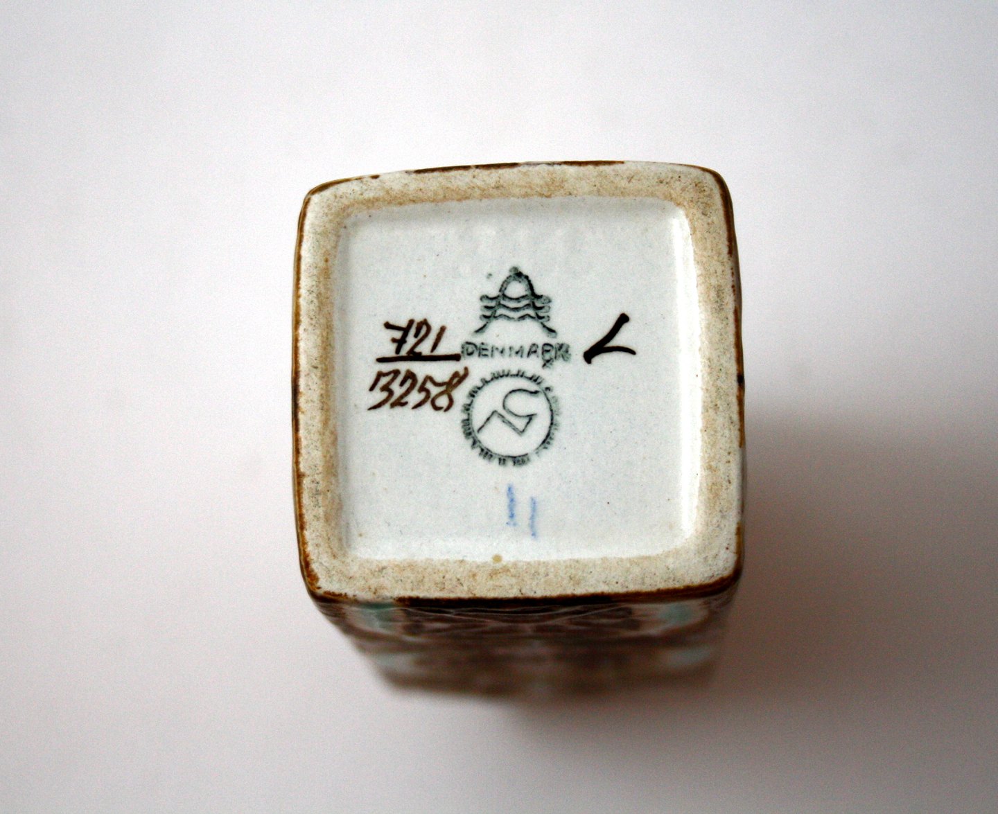 Royal Copenhagen, Baca Fajance i brun og turkis glasur, lille firkantet miniature vase designet af Nils Thorsson. Nr. 721/3258. Højde 12,5 cm. Bredde 4x4 cm cm. Pris: SOLGT