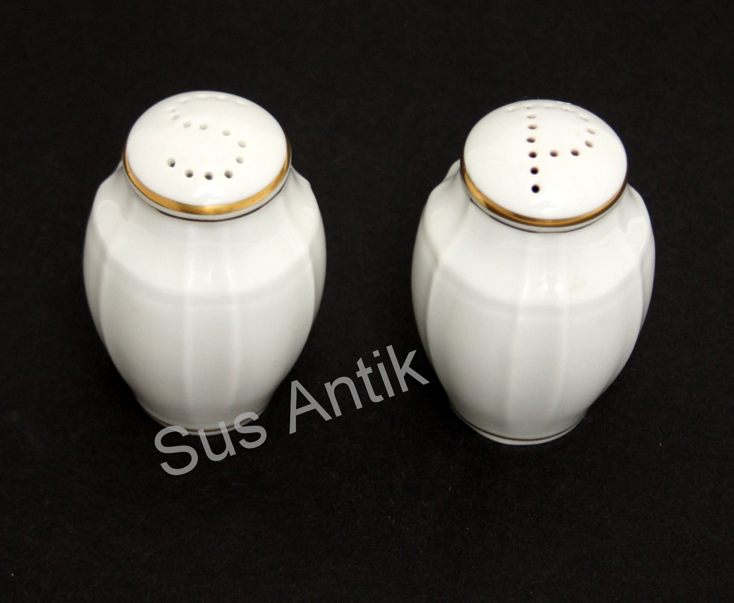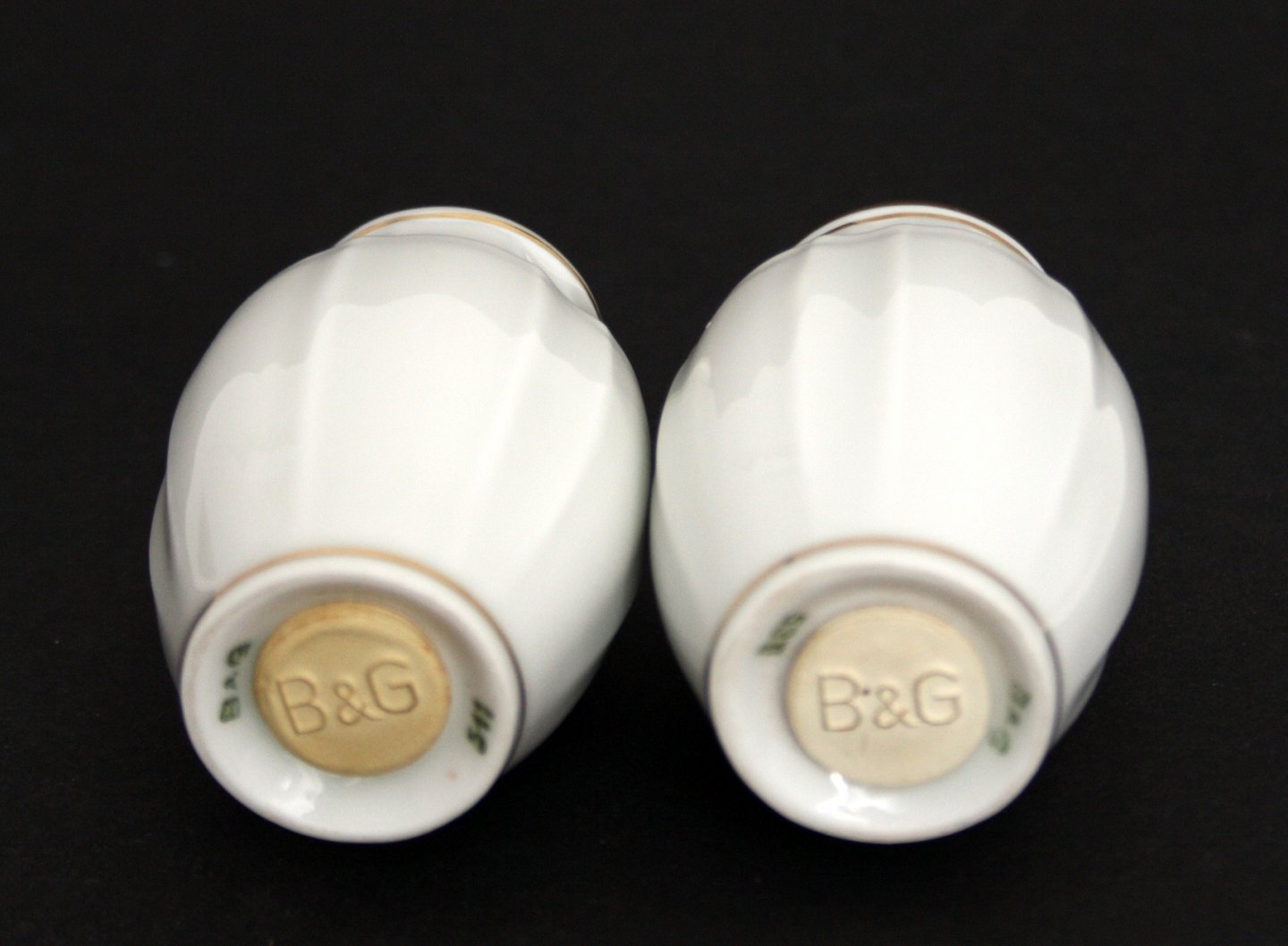 Bing & Grøndahl, Offenbach, Salt og Peber. Hvidt svejfet porcelæn med guldkant. Salt. Nr. 541. Højde 7,5 cm. Peber. Nr. 531. Højde 7,5 cm. Pris: SOLGT Nye gummipropper kan tilkøbes for 25 kr. stk.