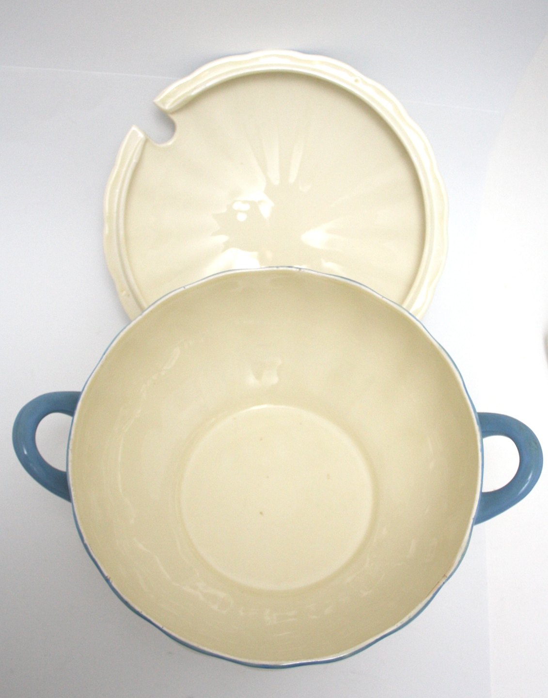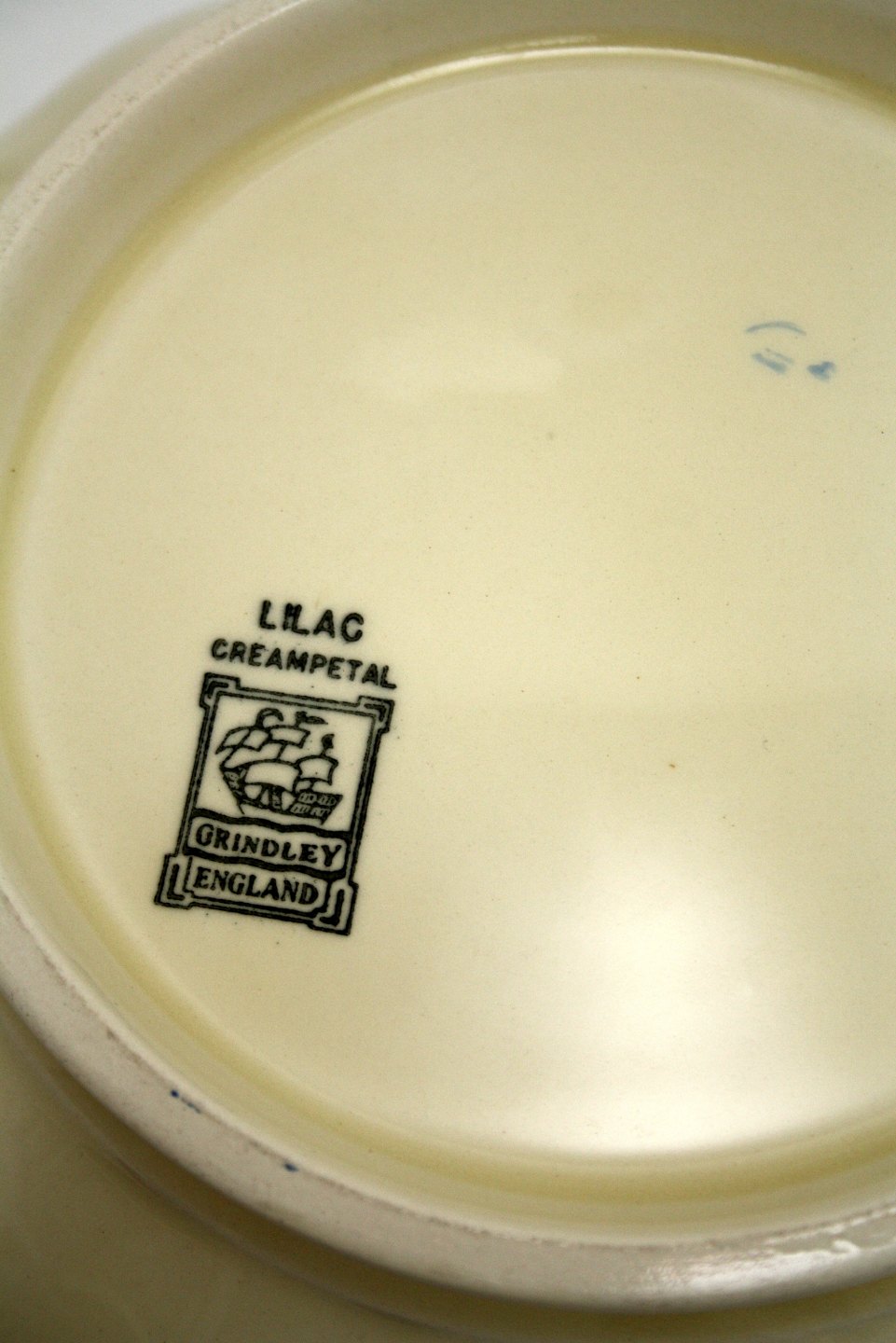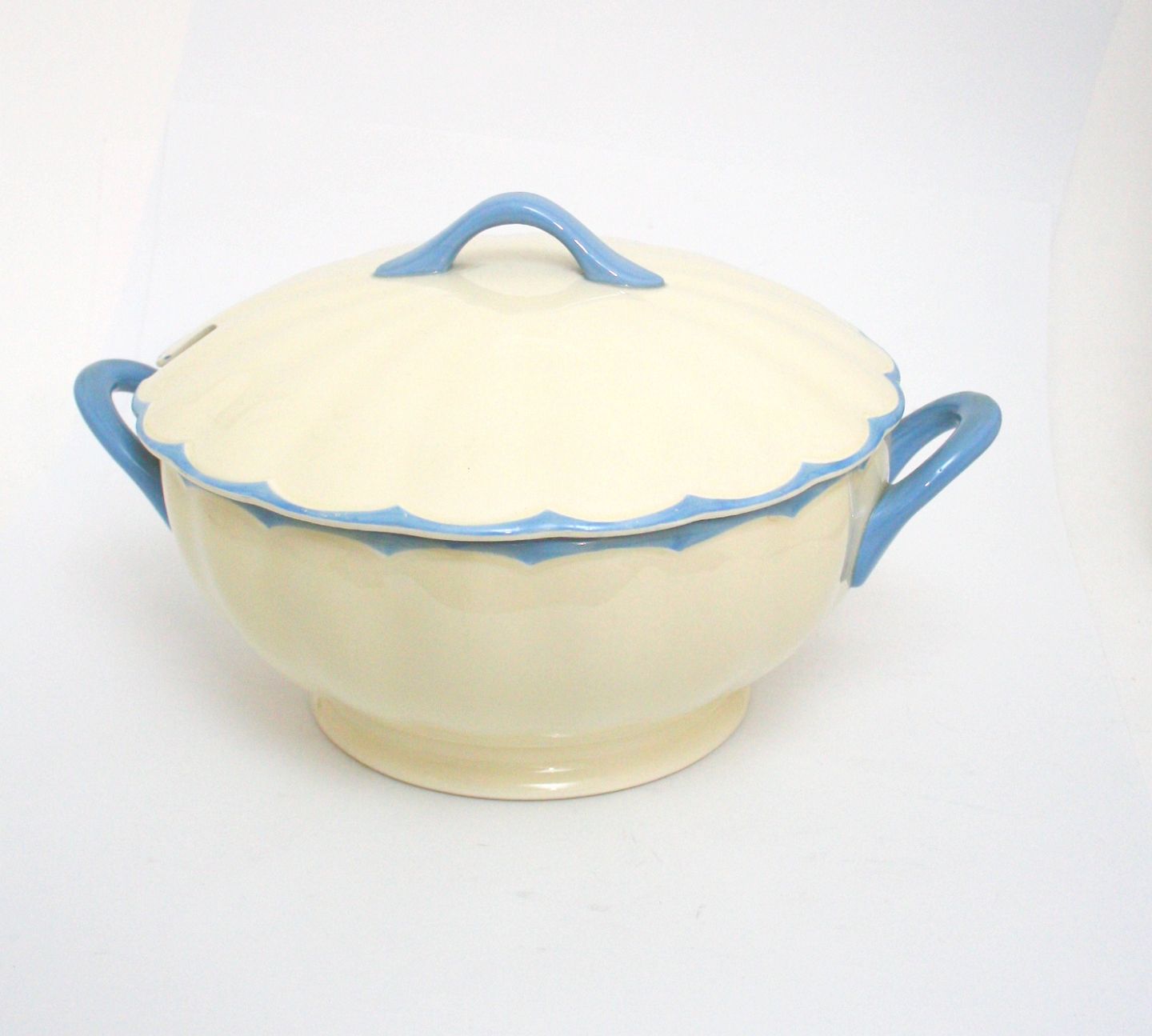 Grindley England fajance, Lilac Creampetal Terrin med låg med plads til ske. Skøn cremefarvet terrin med lyseblå hanke og kanter fra 1930'erne. Højde 18,5 cm. Diameter 25 cm. Flot stand. Pris: SOLGT