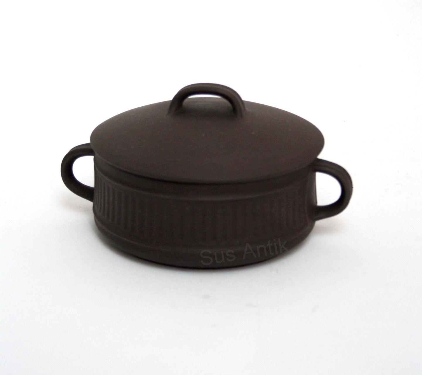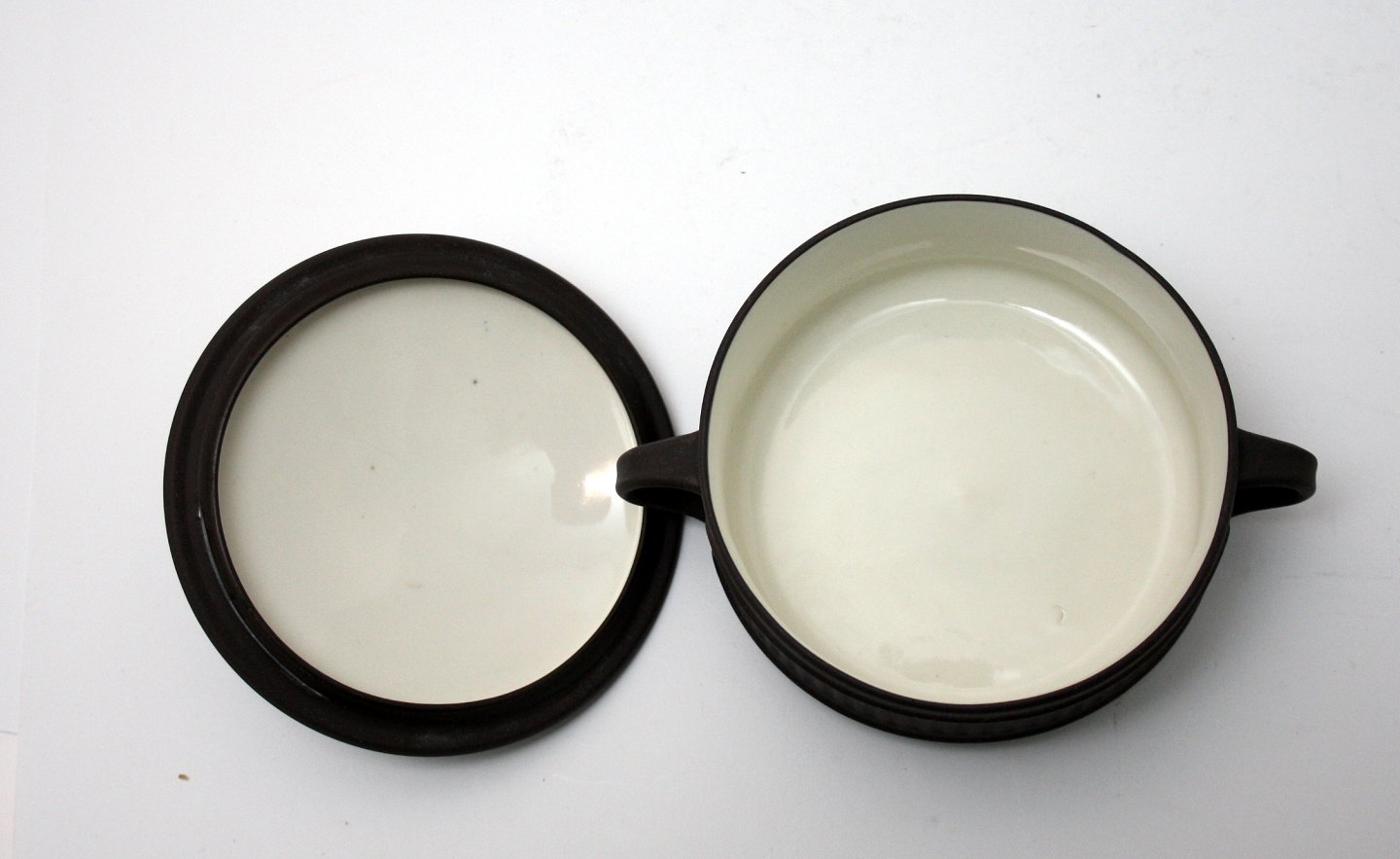 Eslau Danmark. Flamestone, Sukkerskål eller boullionkop med låg. Indvendig hvid glasur, yderside i rå uglaseret stentøj. Designet af Jens Harald Quistgaard i 1950,erne. Signeret IHQ, Dansk Designs, Denmark. Højde 8,5 cm. Diameter 12 cm. Længde 16 cm.