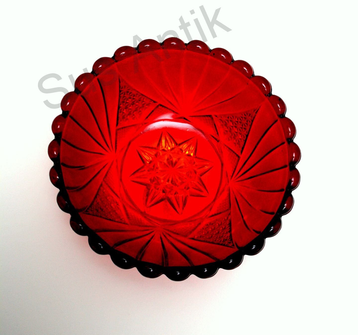 Fyens Glasværk, Rubinrød skål med orange nuance i presset glas fra 1924. Højde 8,5 cm. Diameter 23 cm. God stand. Pris: SOLGT