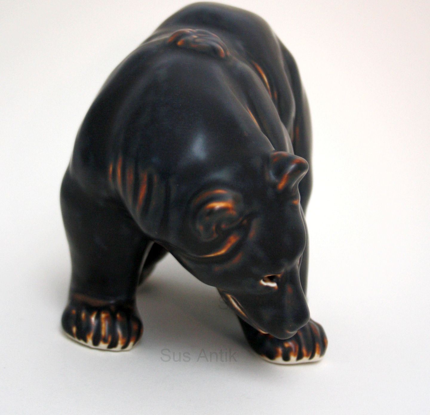 Royal Copenhagen, stoneware, brun glasur. Stående bjørnefar. Formgivet af Knud Kyhn. Nr. 21519. Højde 15,5 cm. Længde 18 cm. III. sortering. Pris: SOLGT