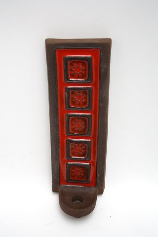 Strehla, West Germany. Firkantet vase i brunmeleret mat glasur med relief mønster og orange glasur. Højde 21 cm. 10 x 7 cm. Pris: SOLGT