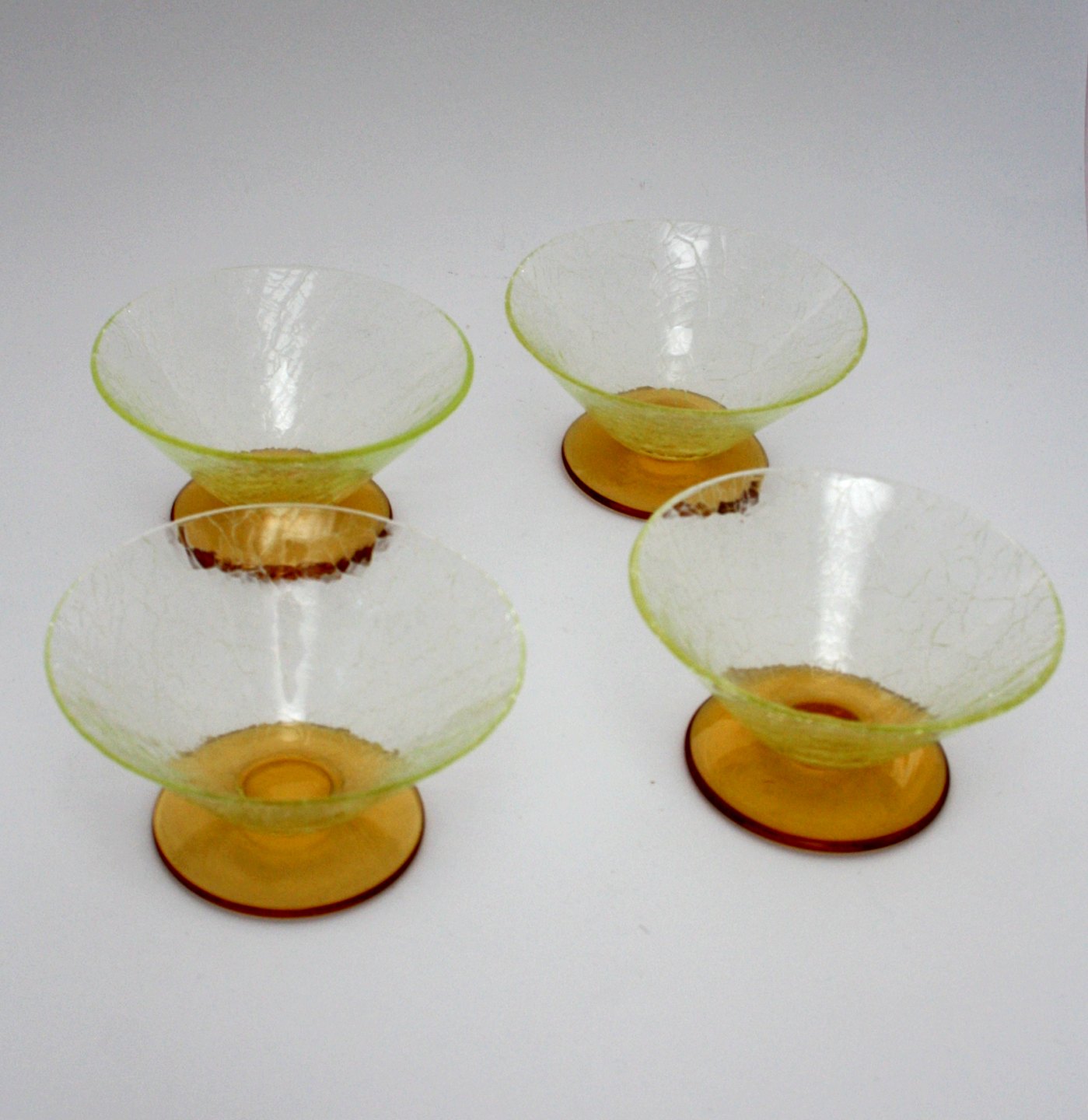 Lysegul craquelé skål med rav farvet fod. Kan bruges til cocktail, champagne, is eller portionsskål. Højde 5,7 cm. Diameter 11 cm. Sælges samlet. Pris: SOLGT