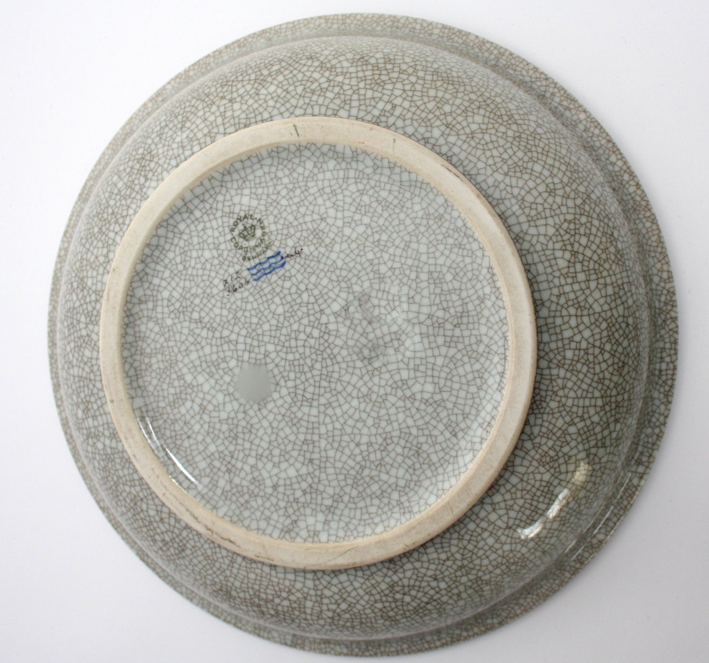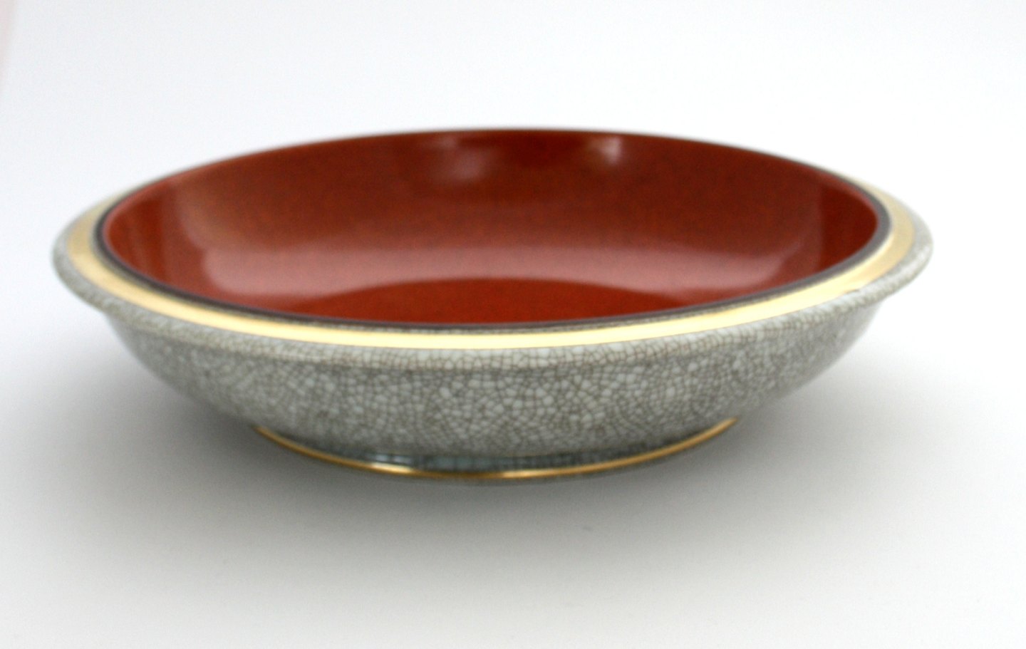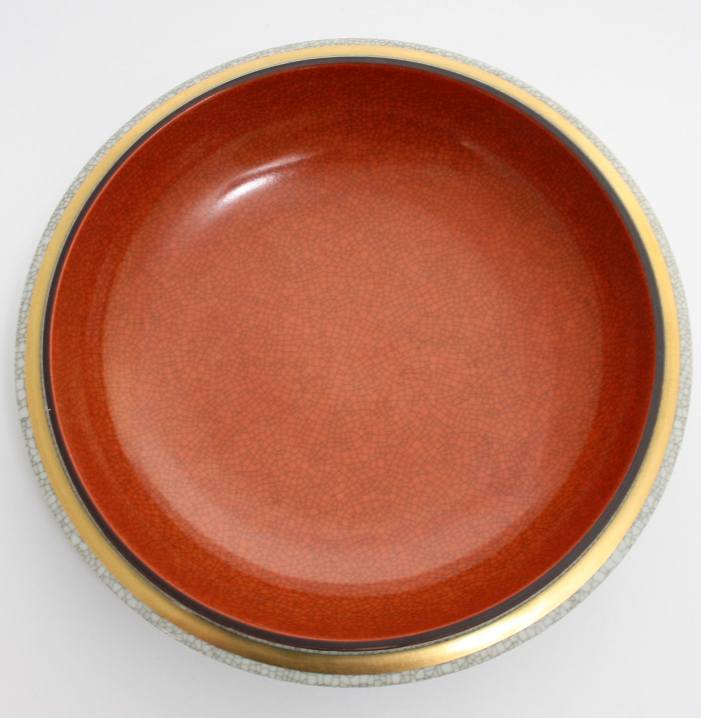 Royal Copenhagen, Krakelé (craquelé) i orange og grå med guldkanter. Stor skål/fad. Nr. 212/3606. Højde 5 cm. Diameter 25,5 cm. Pris: SOLGT