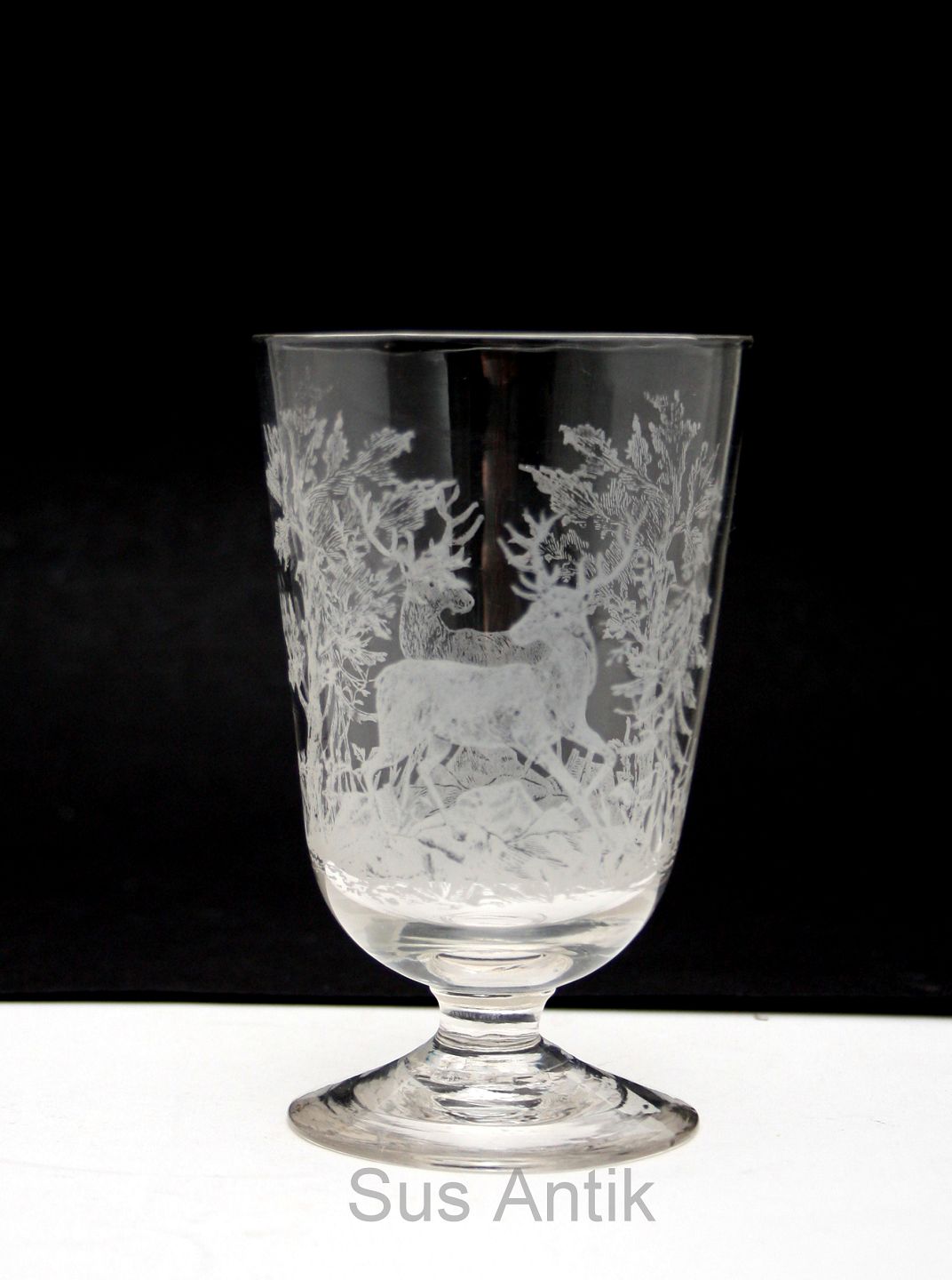 Kastrup Glasværk katalog 1910, Drikkeglas på lav fod med hjortemotiv, knækket i bund. Højde 11 cm. Diameter ca. 7 cm. Pris: SOLGT