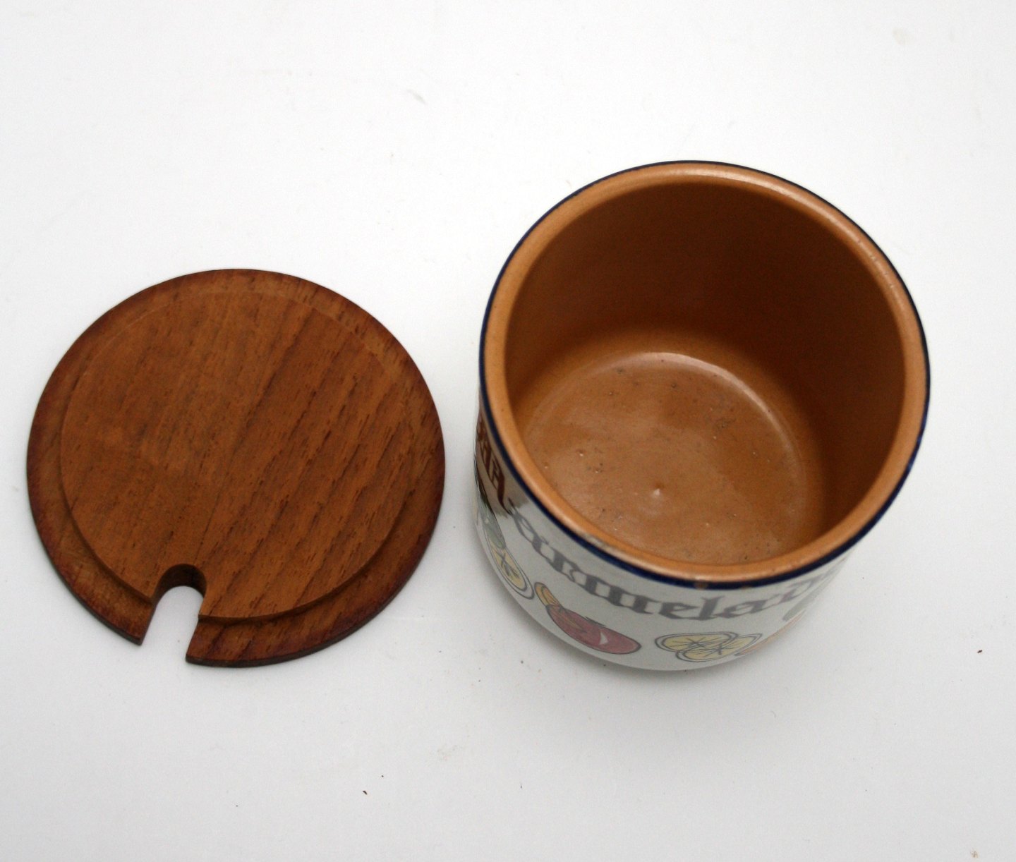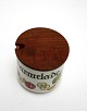 Marmelade med låg med plads til ske (lille). Højde 9 cm. Diameter 9 cm. Overfladekrakeleringer og lille kantafslag. Pris: SOLGT