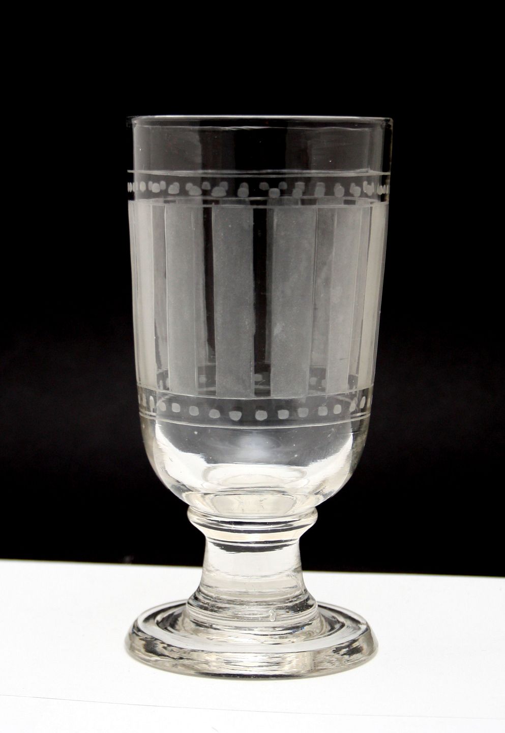 Glas med indgraveret mønster i form af striber og bomber. Knækket bund. Højde 16,2 cm. Øverste diameter 8 cm. Pris: SOLGT