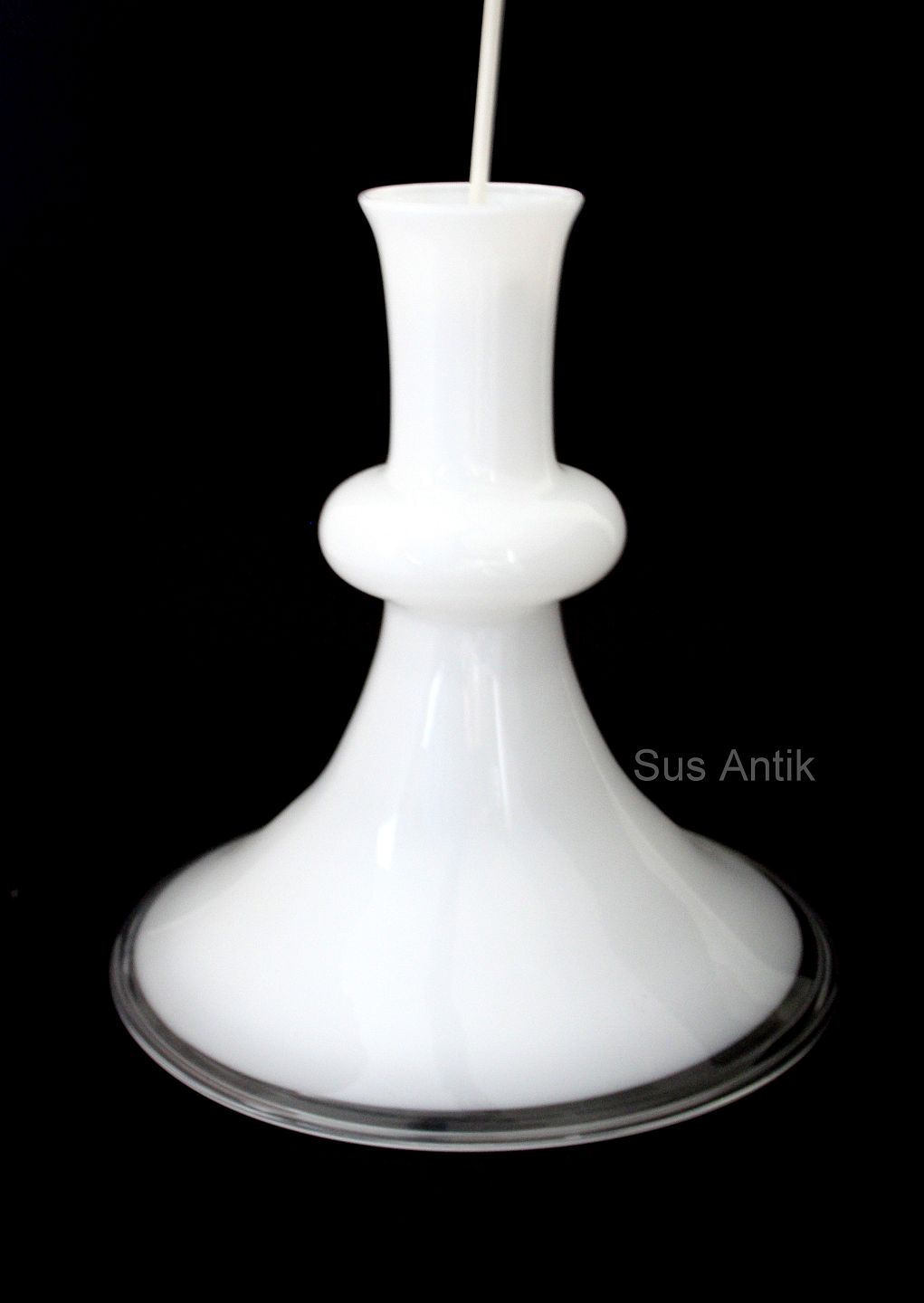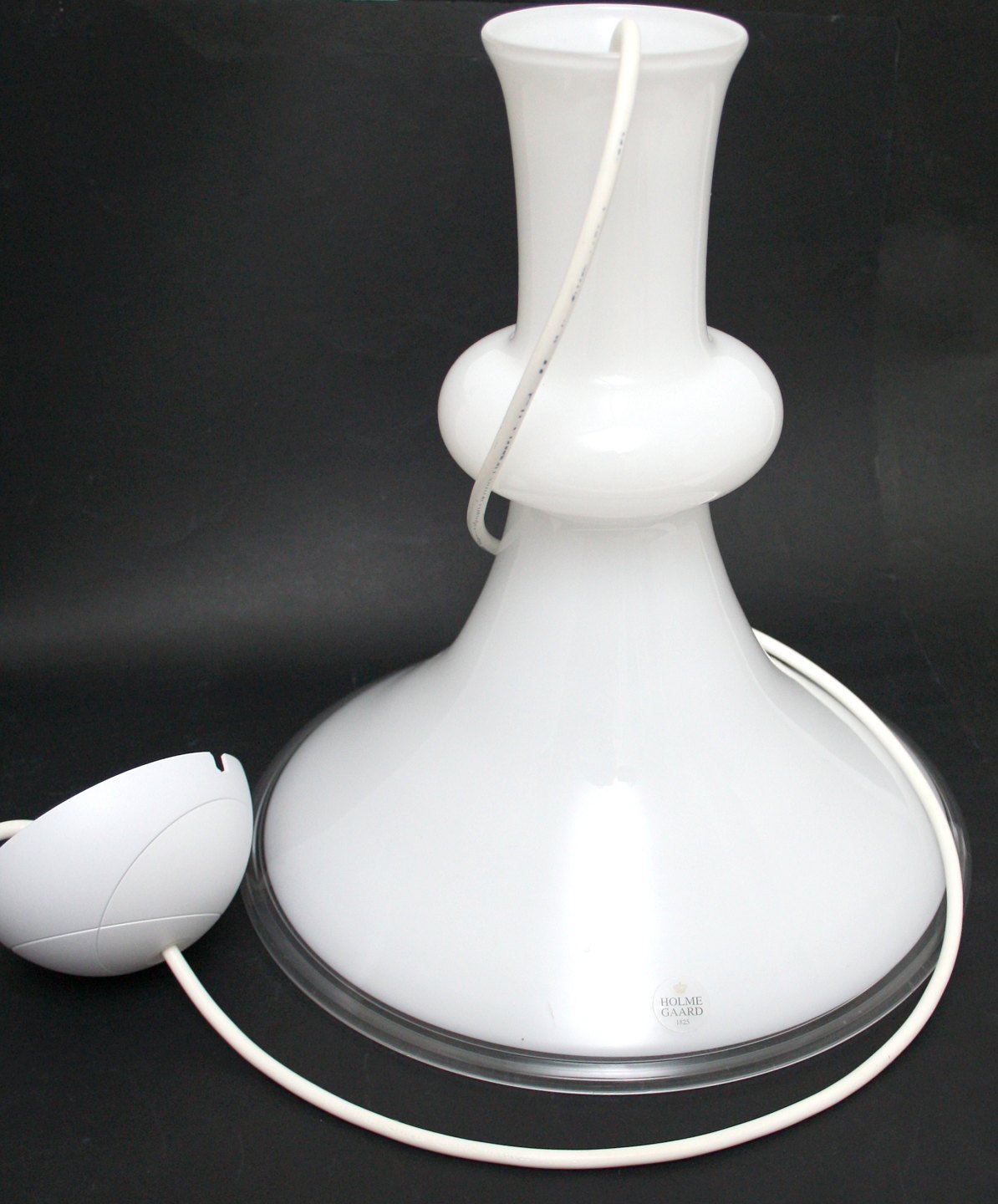 Holmegaard, Etude lampe i opalinehvid glas med klart omfang. Designet af Michael Bang i 1978. Højde 30 cm. Diameter 27,5 cm. Pris: SOLGT