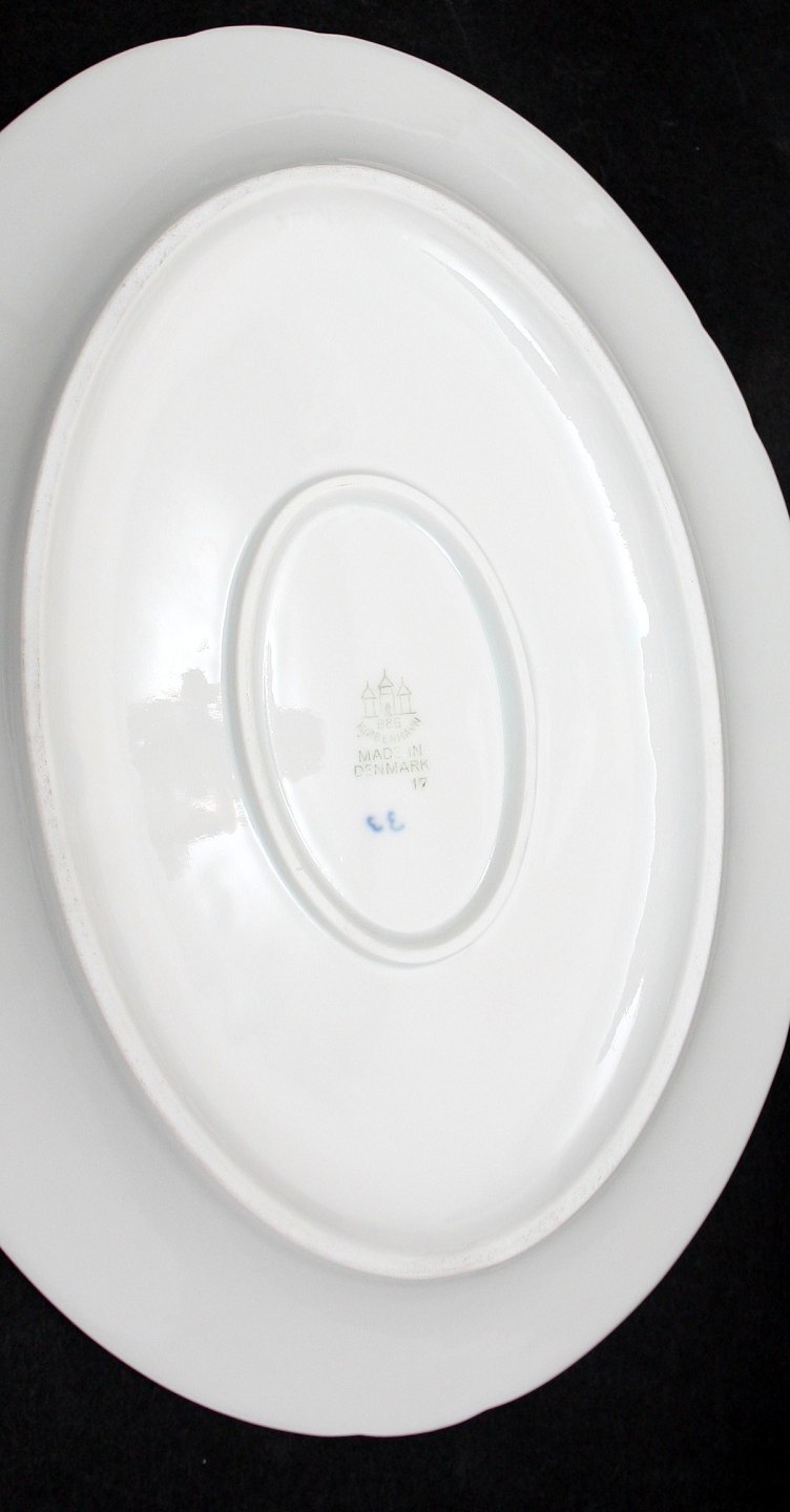 Bing og Grøndahl, Blåmalet (Musselmalet). Ovalt fad mellemstørrelse. Nr. 17. Produceret 1958-1962. Længde 28 cm. Bredde 21 cm. Højde 3,5 cm. II. sortering. Flot stand. Pris:SOLGT