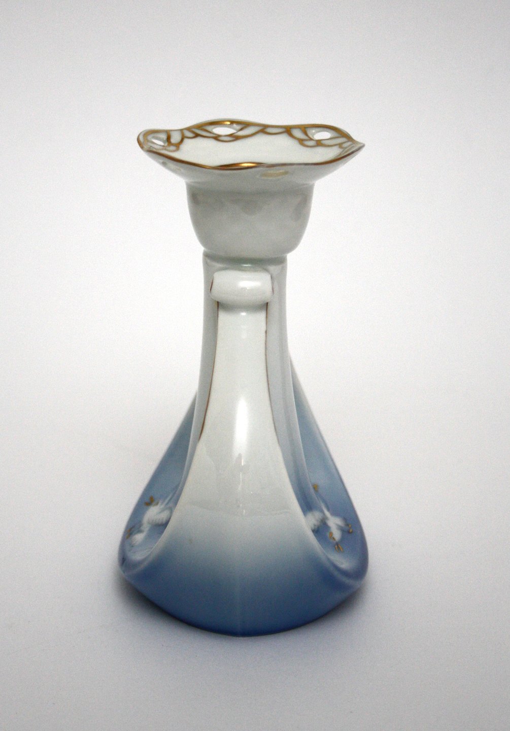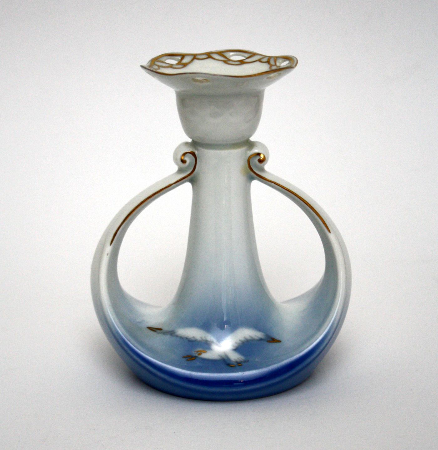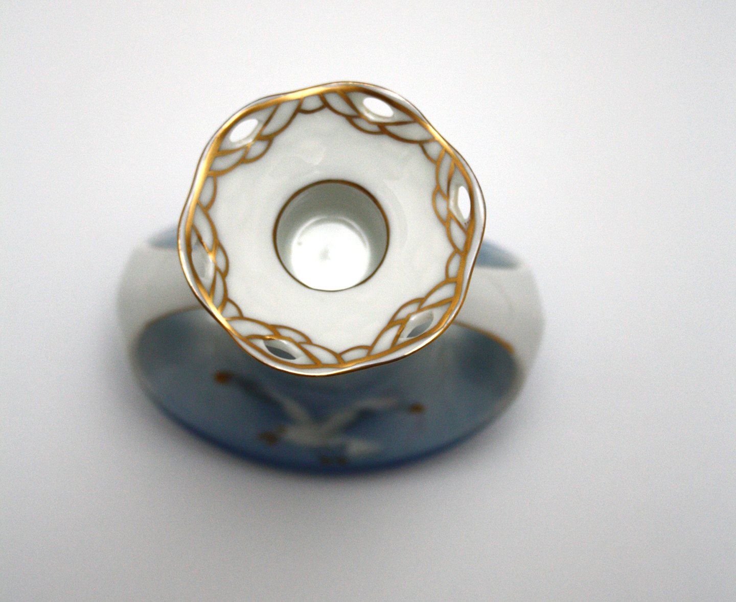 Bing & Grøndahl, Måge med guld, Lysestage med hulkrave. Nr. 503. Produceret mellem 1970 og 1983. Højde 13 cm. Længde 10,5 cm. Fin stand. Pris: SOLGT