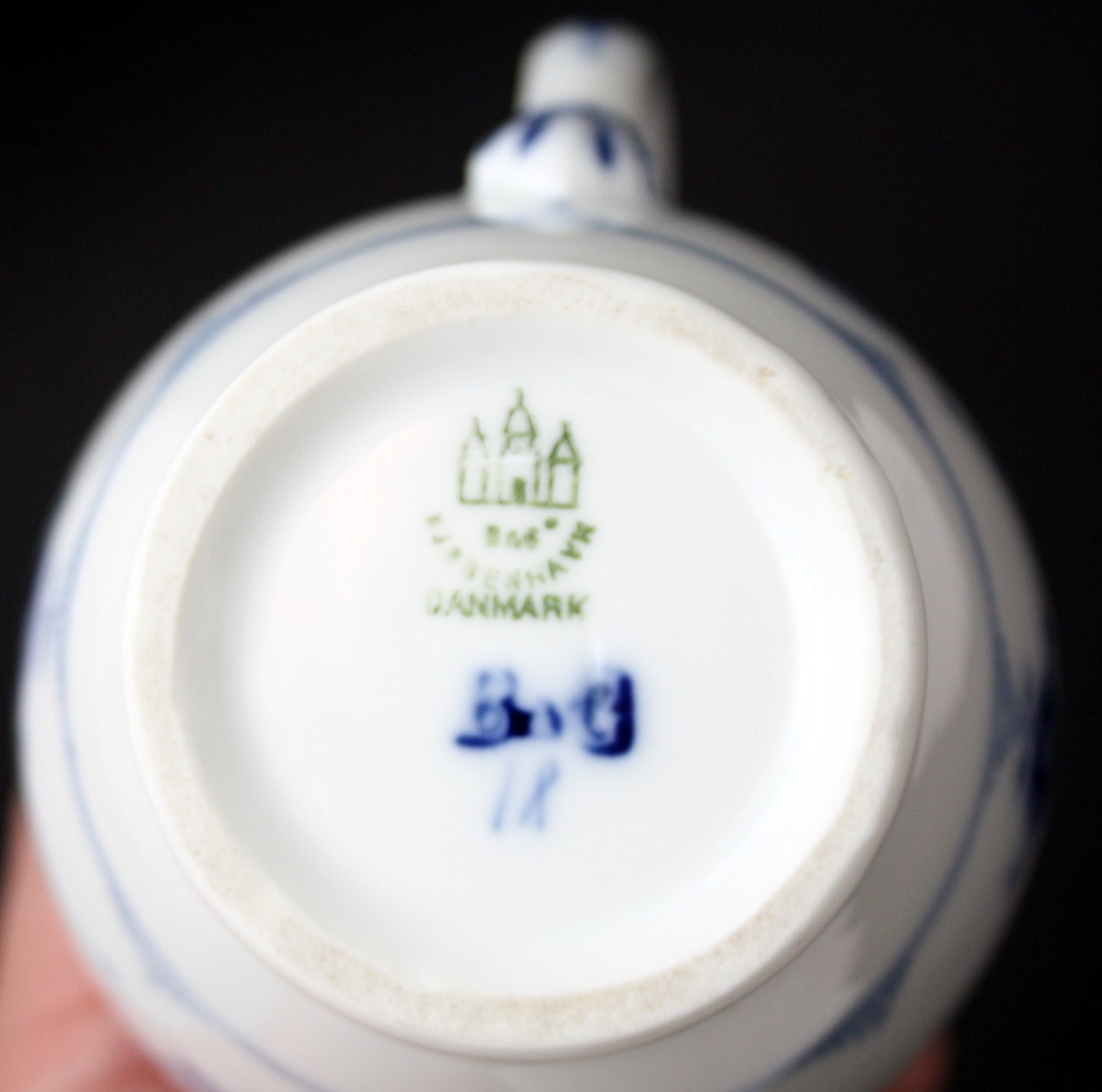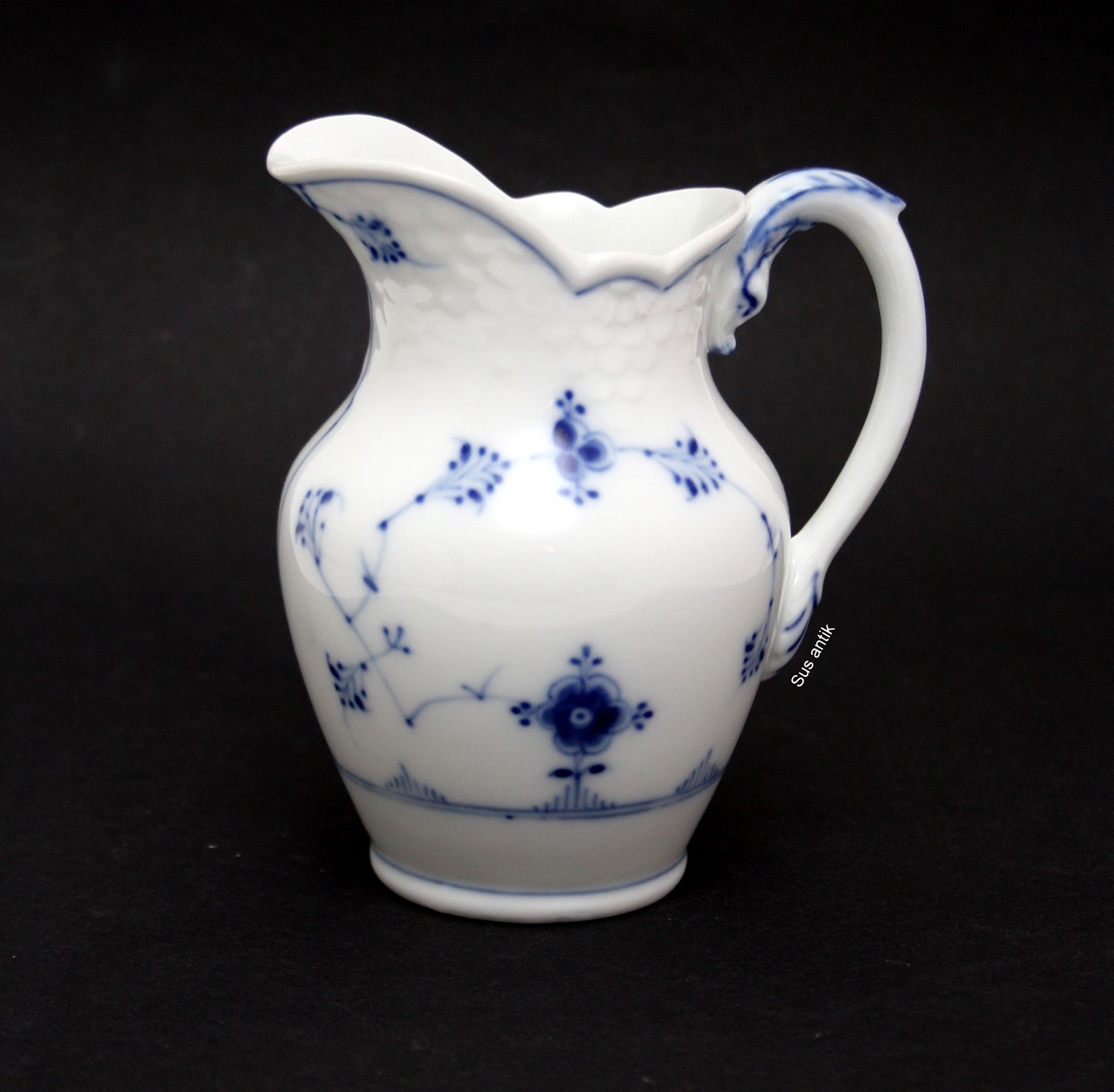 Bing og Grøndahl, Blåmalet (Musselmalet). Mælkekande / stor flødekande med bølget kant. Produceret 1915-1948. Højde 13 cm. II. sortering. Flot stand. Pris: SOLGT