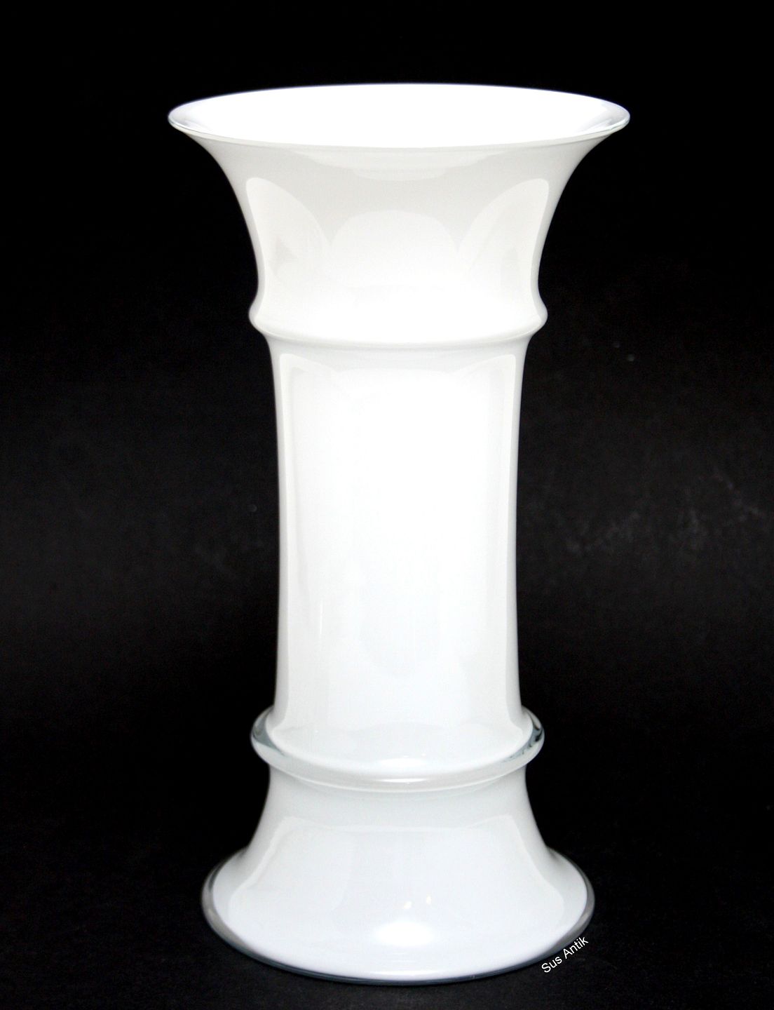 Holmegaard, MB serien designet af Michel Bang i 1981. Formblæst i opal hvid glas med klare krystal overfang. Der er ingen signatur i denne serie. Mellemstor vase. Højde ca. 23 cm. Øverste diameter 12,2 cm. Pris: SOLGT