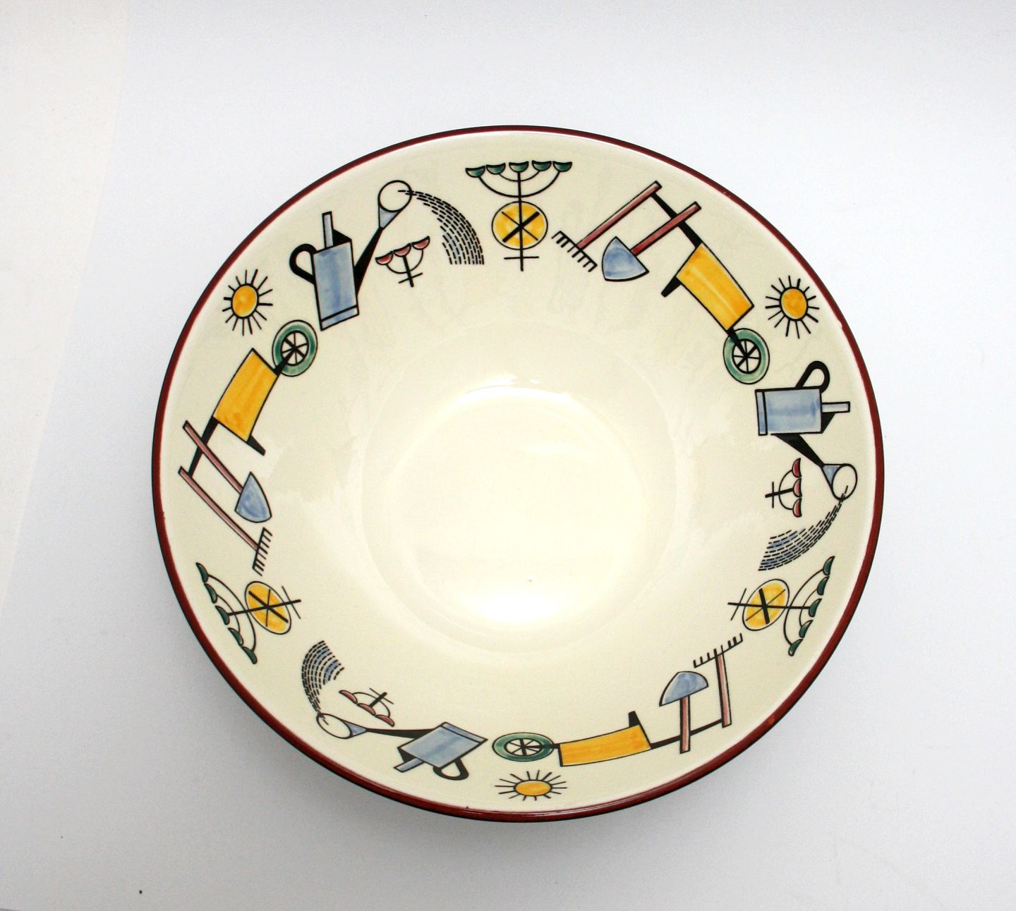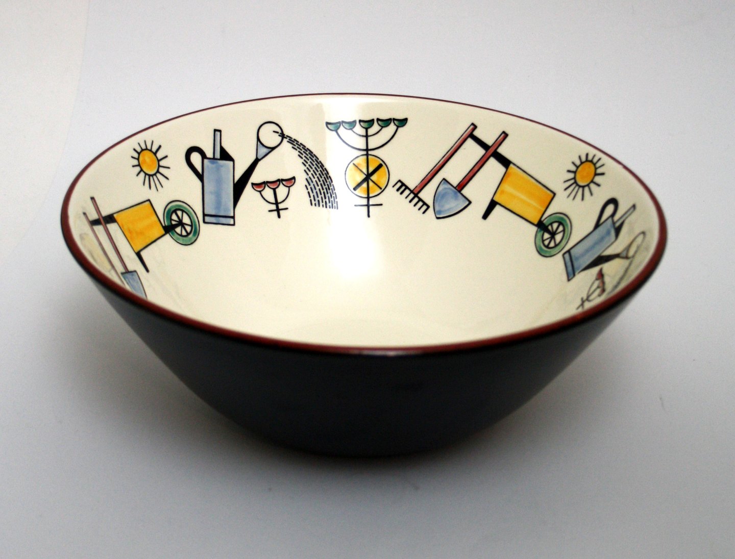 Knabstrup, Symfoni designet af Piotr Baro, formgivet af Johannes Hansen. I produktion i perioden 1959-61. Stor skål med haveredskaber. Diameter 25 cm. Højde 10 cm. Minimal chip glasurafslag på kant, ellers flot stand. Pris: SOLGT
