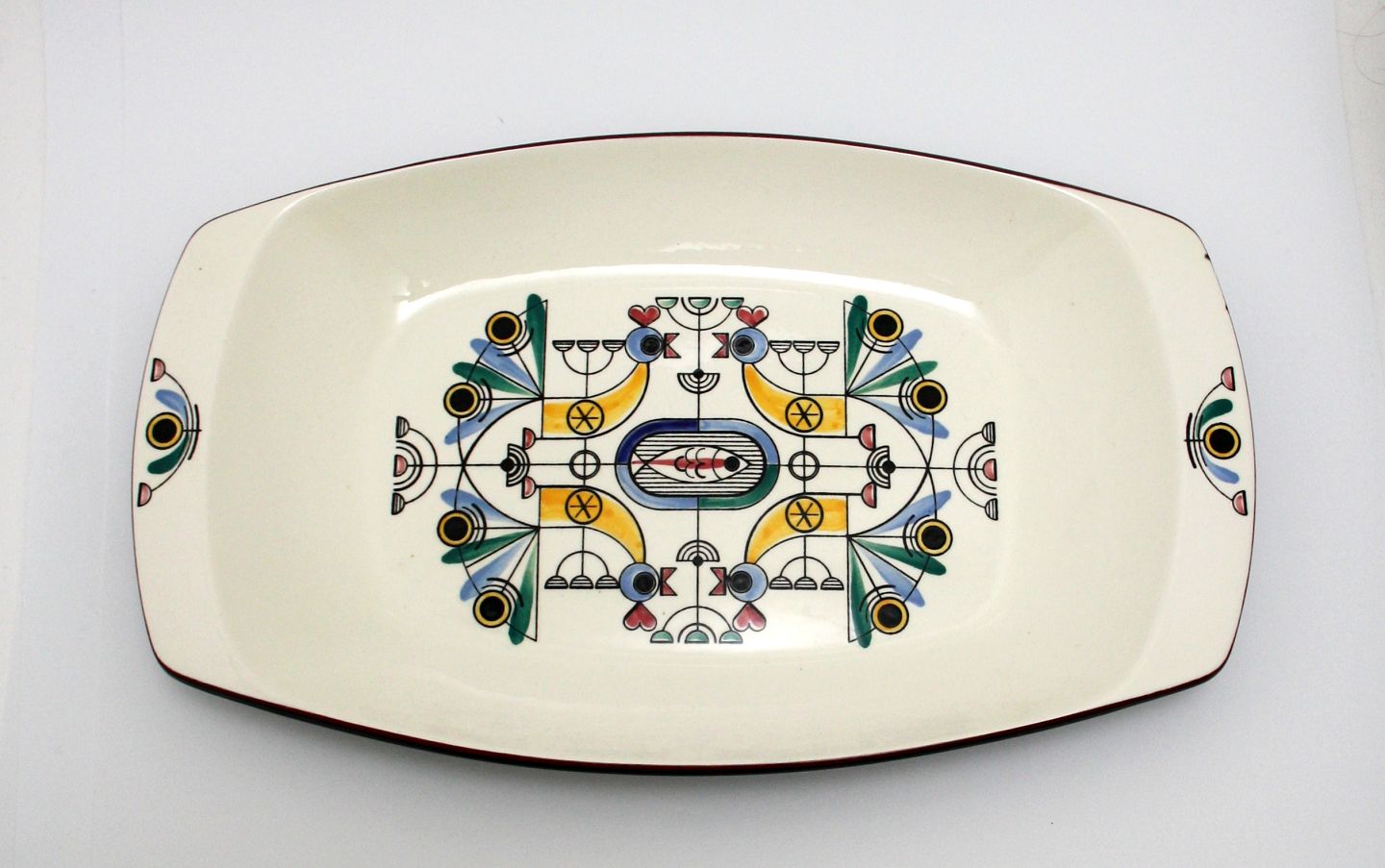 Knabstrup, Symfoni designet af Piotr Baro, formgivet af Johannes Hansen. I produktion i perioden 1959-61. Aflangt fad med fuglemotiv. Længde 34,5 cm. Bredde 20,5 cm. Højde 4 cm. Let overfladekrakelering. Pris: SOLGT