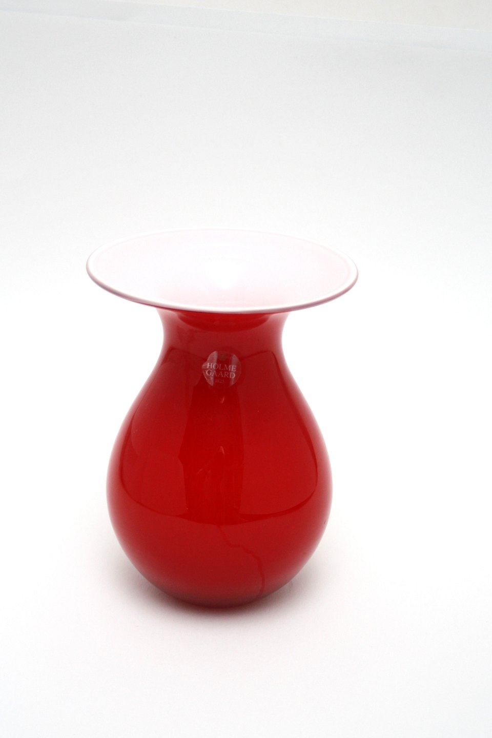 Holmegaard, Shape, Rød vase opalhvid indvendig, mundblæst glas. Designet af Peter Svarrer 2005. Højde 17 cm. Pris: SOLGT