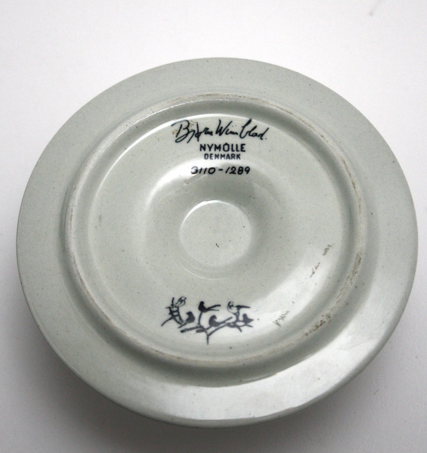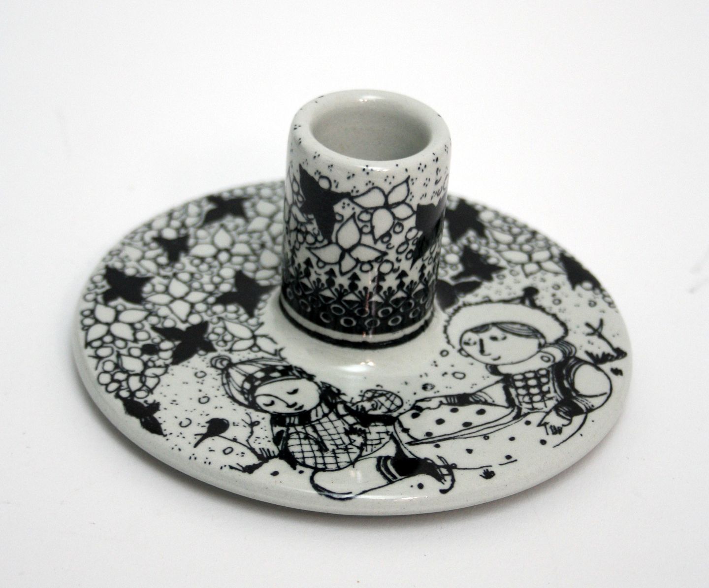 Nymølle, Bjørn Wiinblad, lysestage i sort print med børn i sne. Højde 5 cm. Diameter 11,5 cm. Nr.3110-1289. Pris: SOLGT