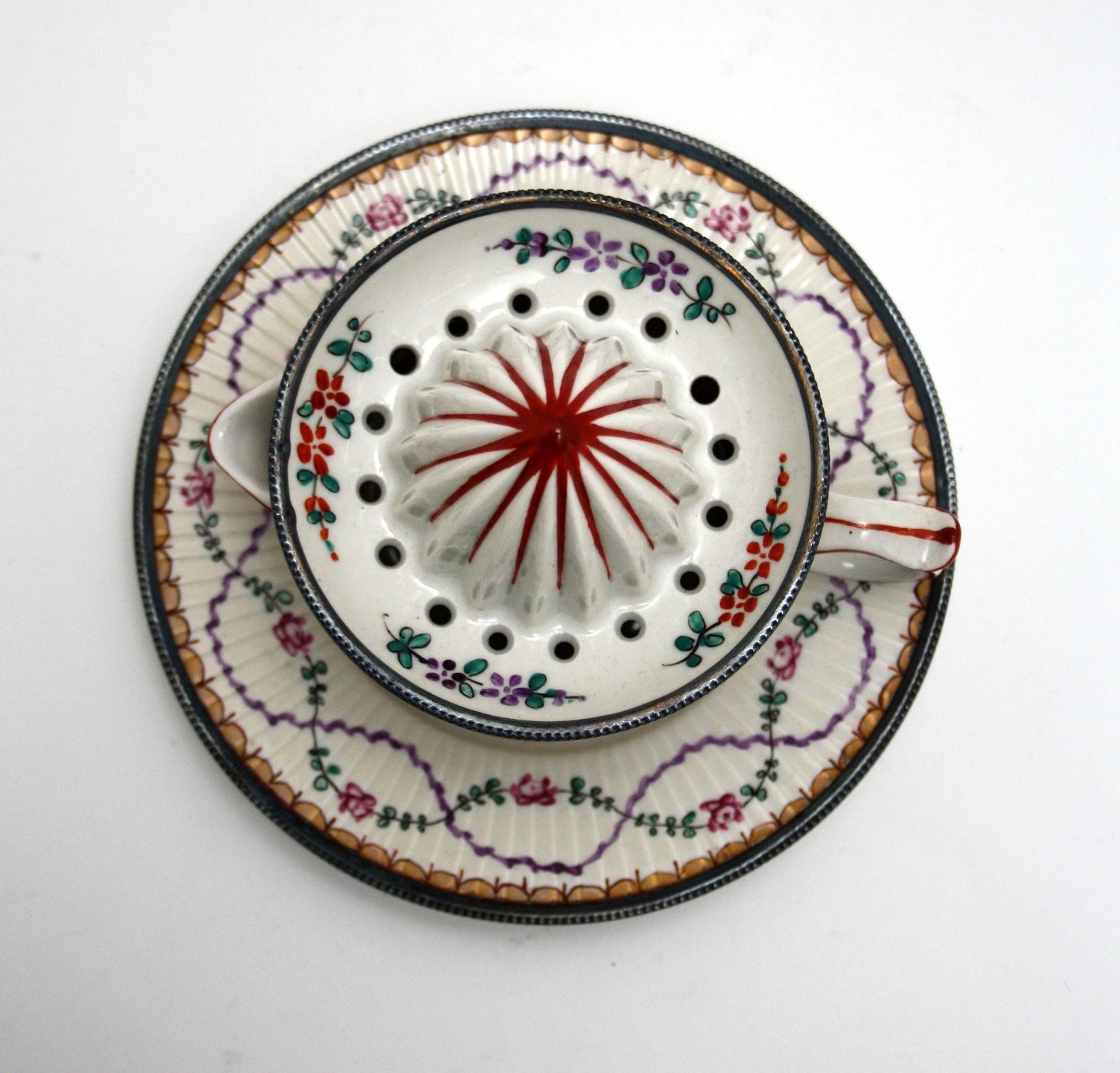 France, Citronpresser i 3 dele. Rillet porcelæn med metalkant. Højde 9,5 cm. Ganske bedårende. God stand. Pris: SOLGT