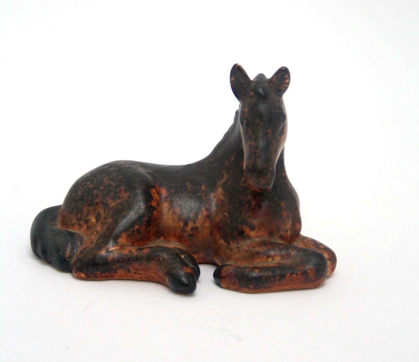 Michael Andersen, Bornholm, Lille liggende føl i brun glasur. Længde 11,5 cm. Højde 8 cm. Flot stand. Pris: SOLGT
