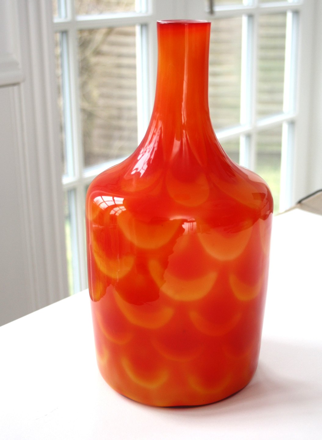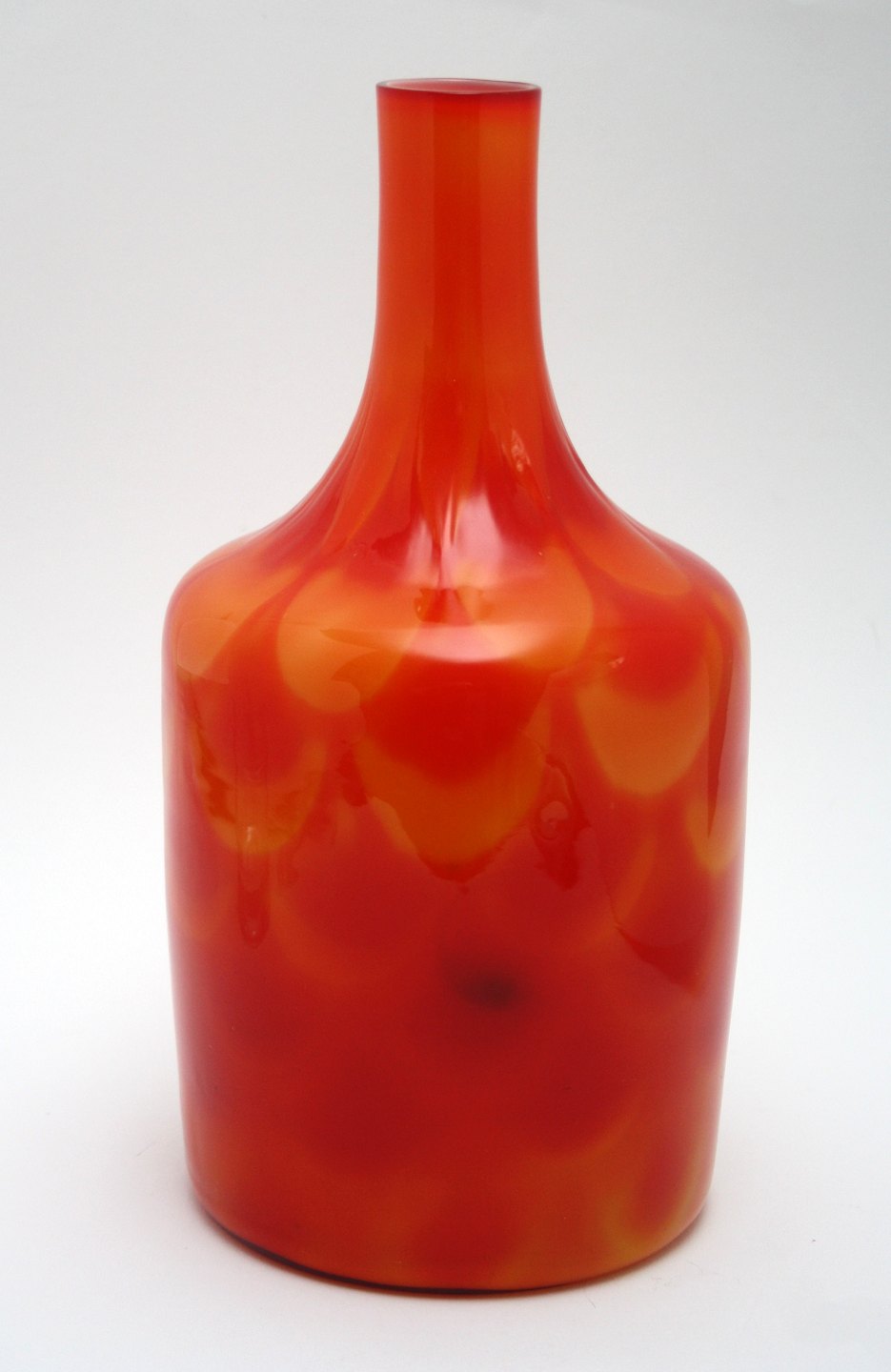 Elme glasværk, Sweden, Peacock vase i rød og orange farvenuancer. Designet af Olof Borgarp i 1960'erne. Højde 27 cm. Diameter 13 bund cm. Fin stand, mørk plet inden i glasset se ekstra foto. Pris: SOLGT