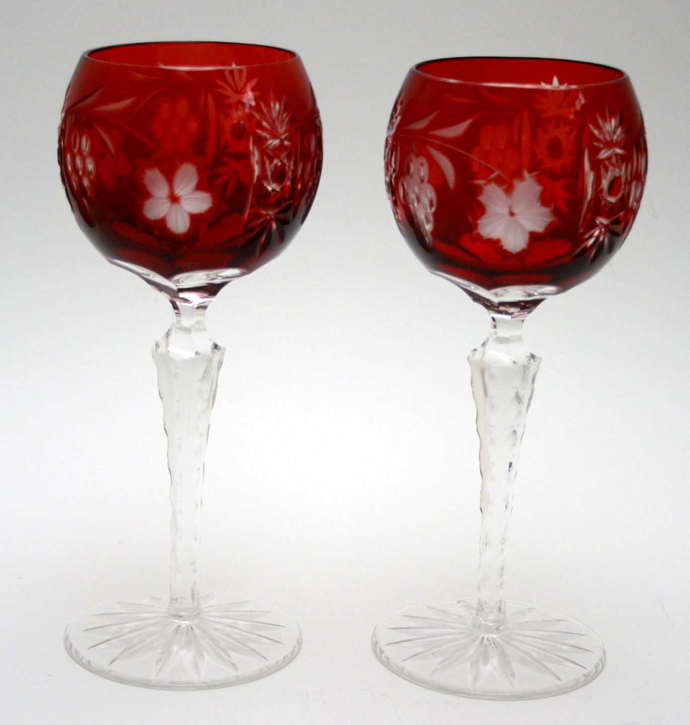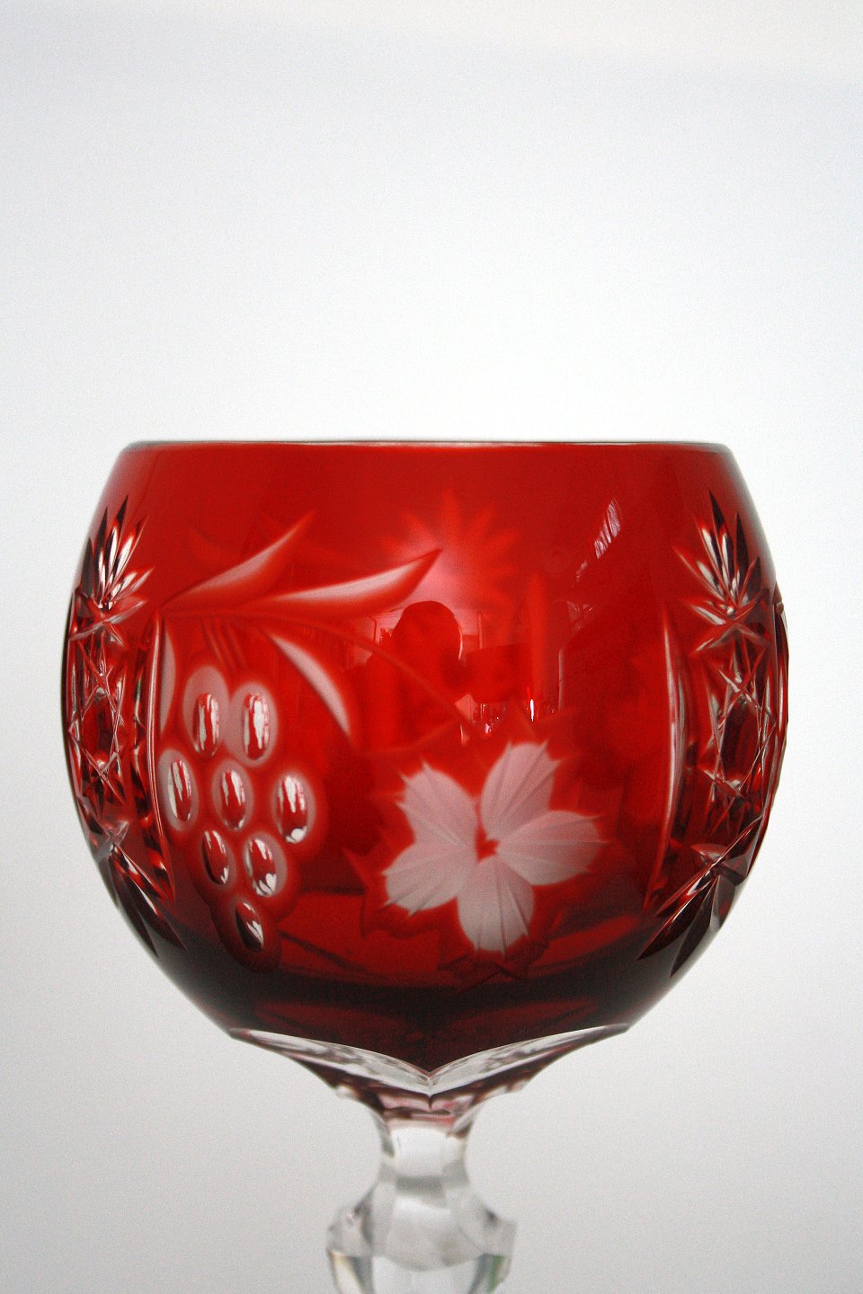 Bøhmisk krystal, Vinglas med rød kumme med slibninger. Slebet på stilk og fod. Højde 20 cm. Øverste diameter 7 cm. Pris: SOLGT
