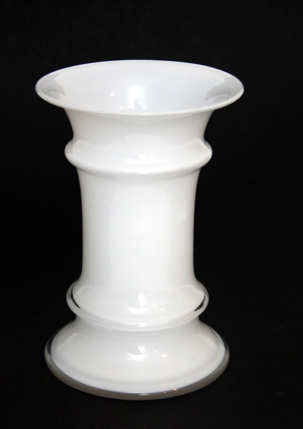 Holmegaard, MB serien designet af Michel Bang i 1981. Mindre vase i formblæst opal hvid glas med klare krystal overfang. Der er ingen signatur i denne serie. Højde ca. 13,5 cm. Øverste diameter 9 cm. Pris: SOLGT