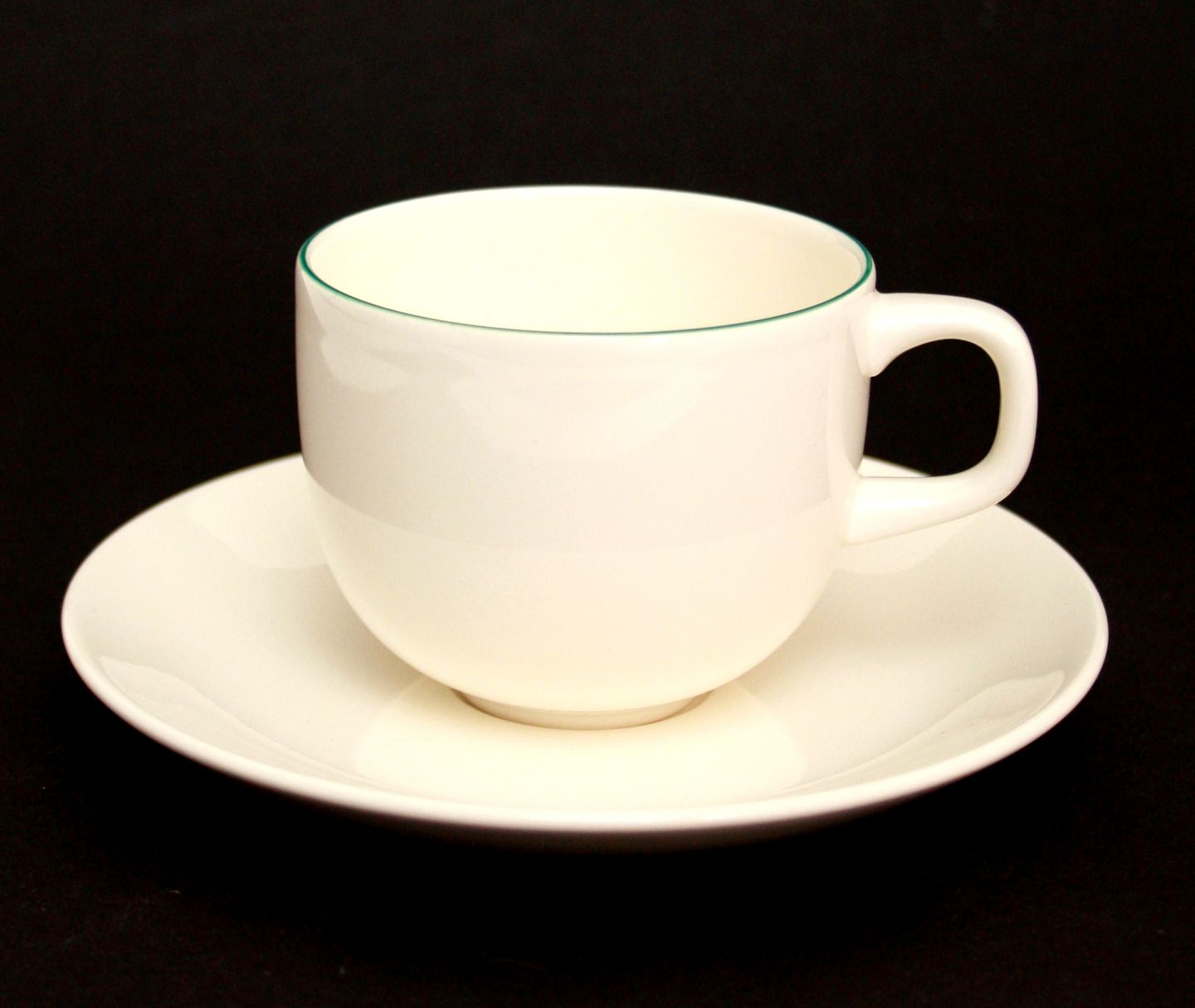 Royal Copenhagen, 4 All Seasons, Kaffekop med mørkegrøn kantstribe og hvid underkop. Designet af Grethe Meyer. Nr. 072. Diameter 8 cm. Højde 6,5 cm. Underkop 073 diameter 14,7 cm. I. Sortering. Pris: SOLGT