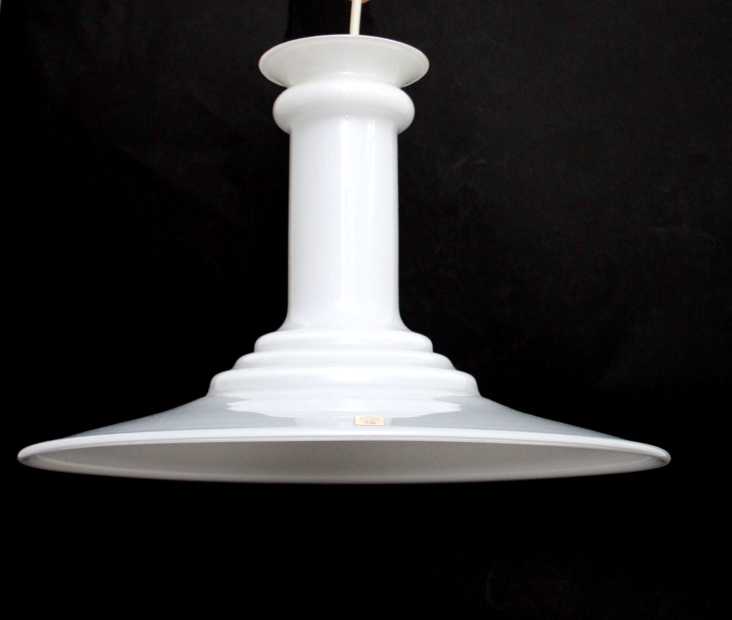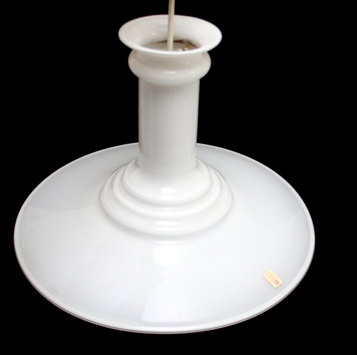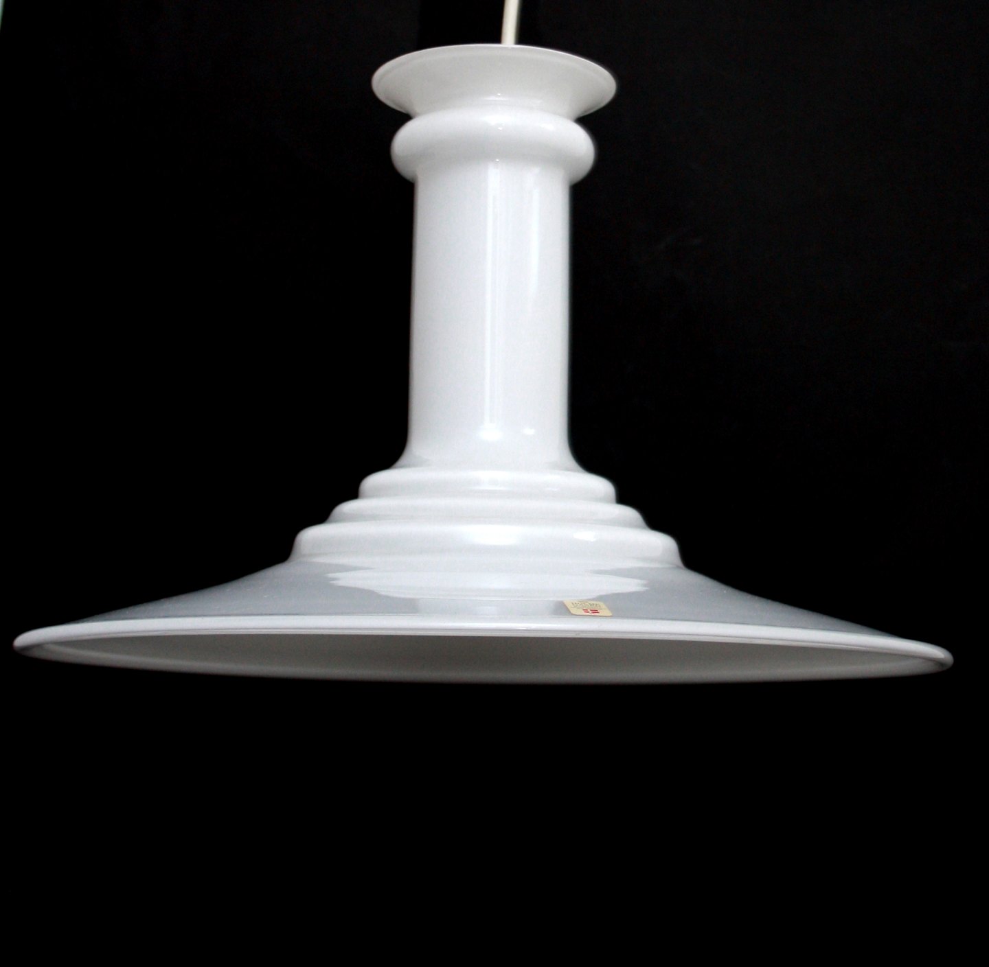 Holmegaard, Mythos pendel i hvid opalineglas. Designet af Sidse Werner i 1989. Højde 23,5 cm. Diameter 35 cm. Flot stand. Pris: SOLGT