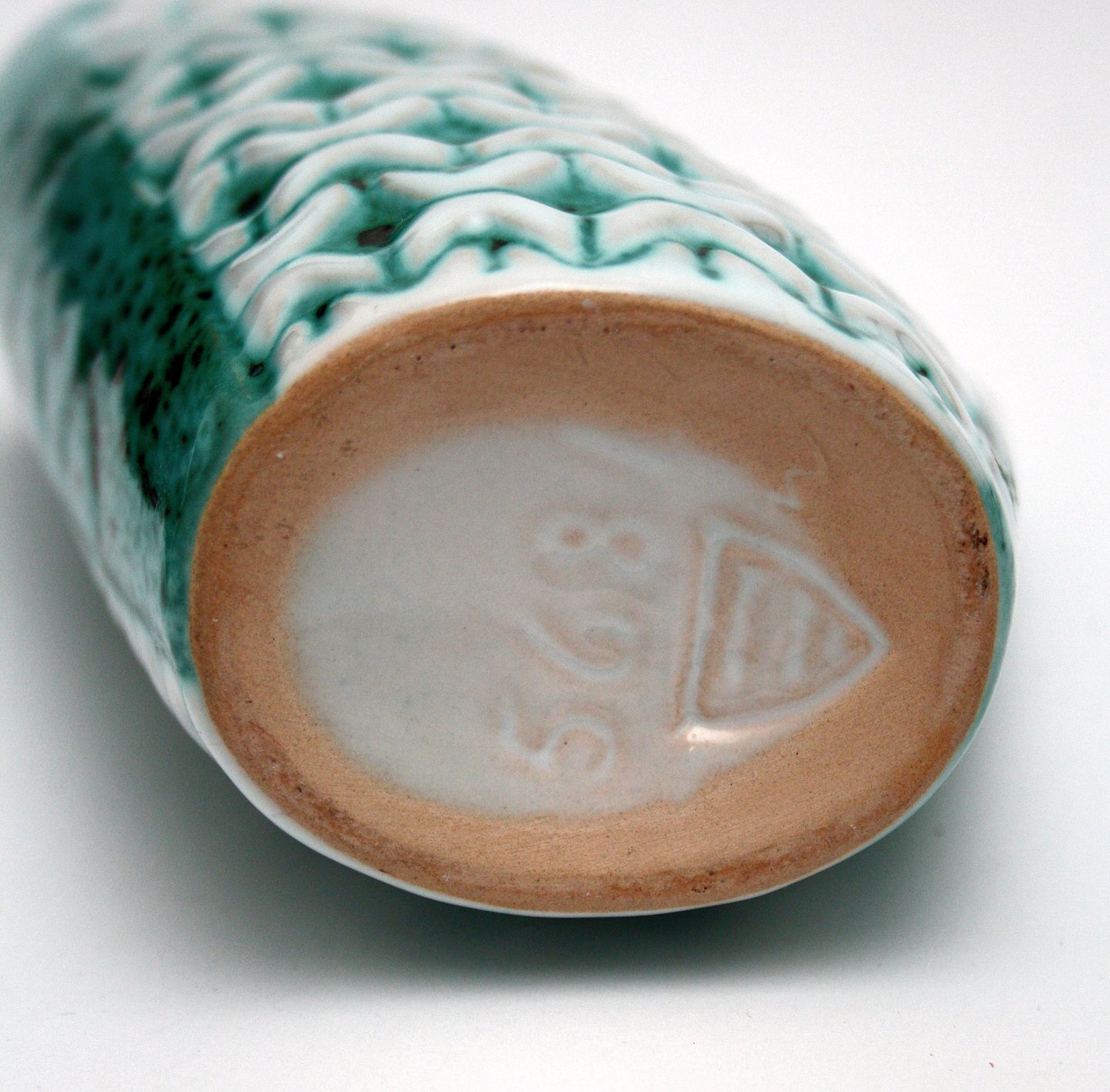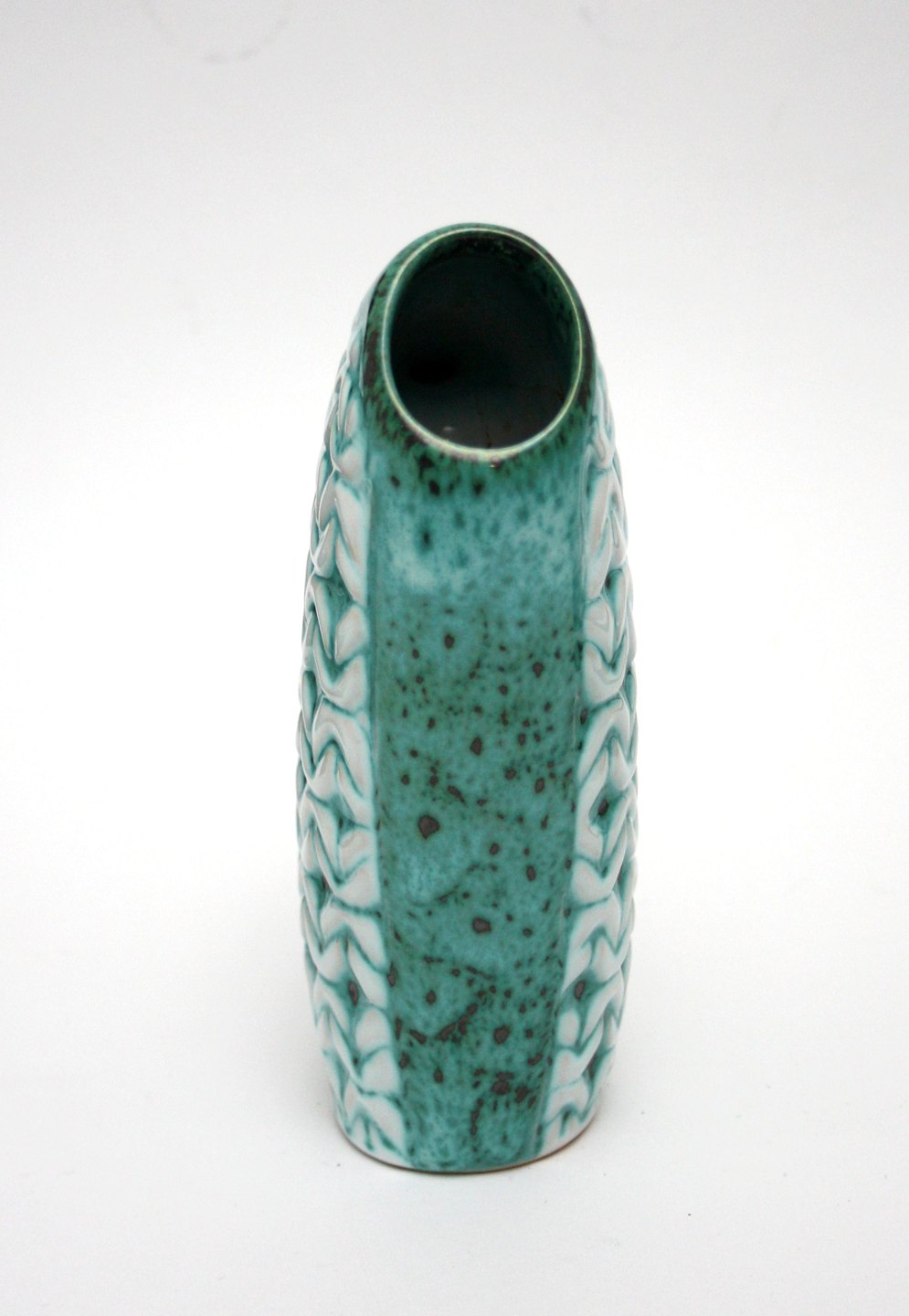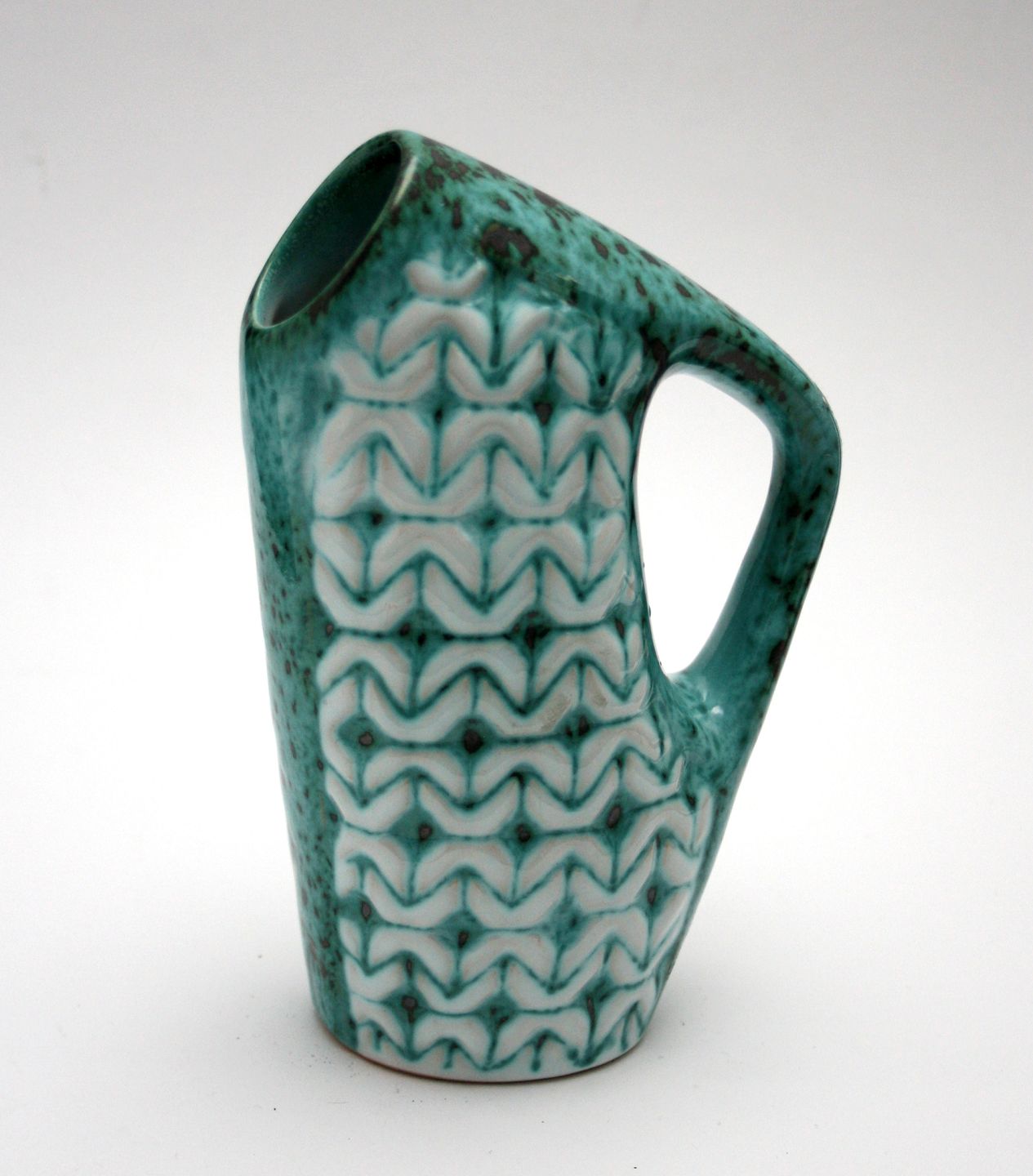 Michael Andersen, Bornholm, Grøn turkis kande/vase med hvidt reliefmotiv og hank. Nr. 5681. Højde 17,5 cm. Længde 12 cm. Fin stand. Pris: SOLGT