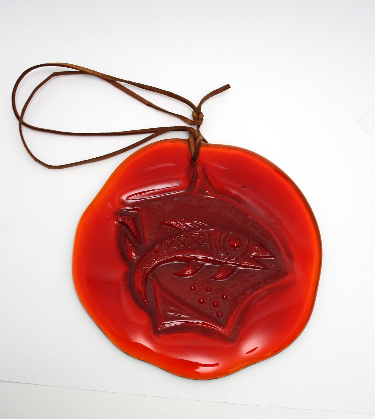 Stor rød solfanger med fiskemotiv med læderrem. Diameter ca. 21 cm. Fin stand. Pris: SOLGT