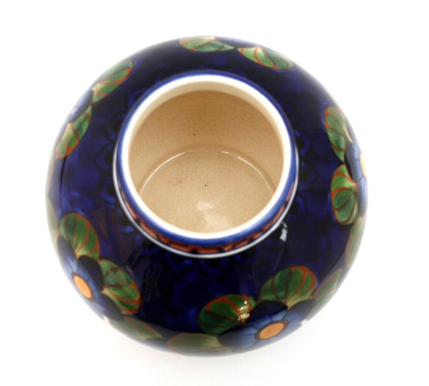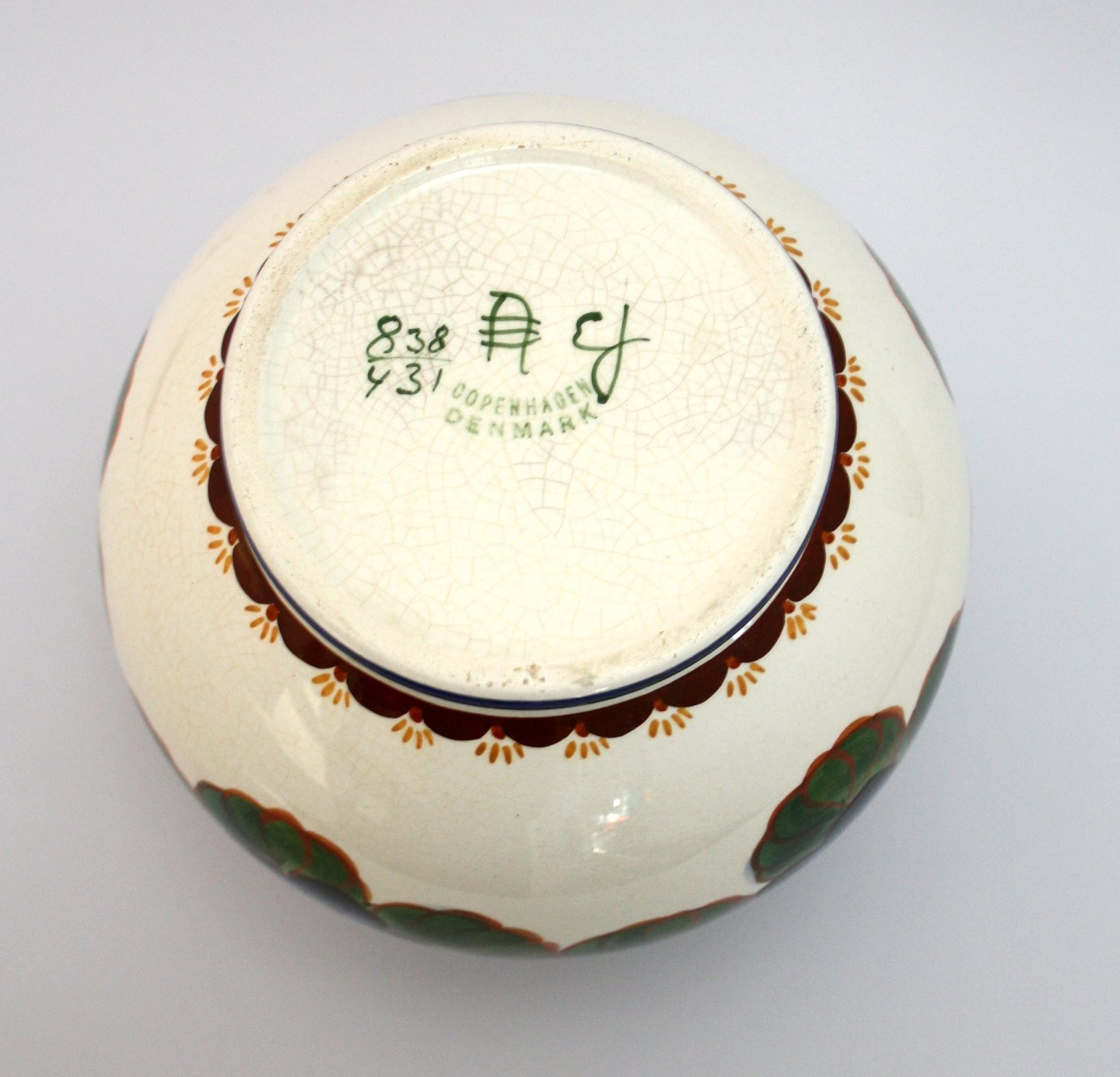 Aluminia, Kugle vase, rund vase fra skønvirkeperioden dekoration "Heibergs blå blomster." Designet af Harald Slott-Møller i 1912. Nr. 838/431. Højde 16 cm. Største diameter ca. 14 cm. Flot stand med overfladekrakeleringer, ingen afslag. Pris: SOLGT