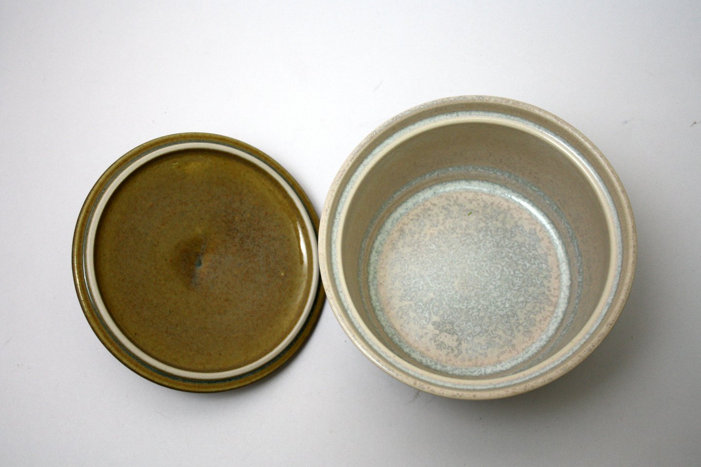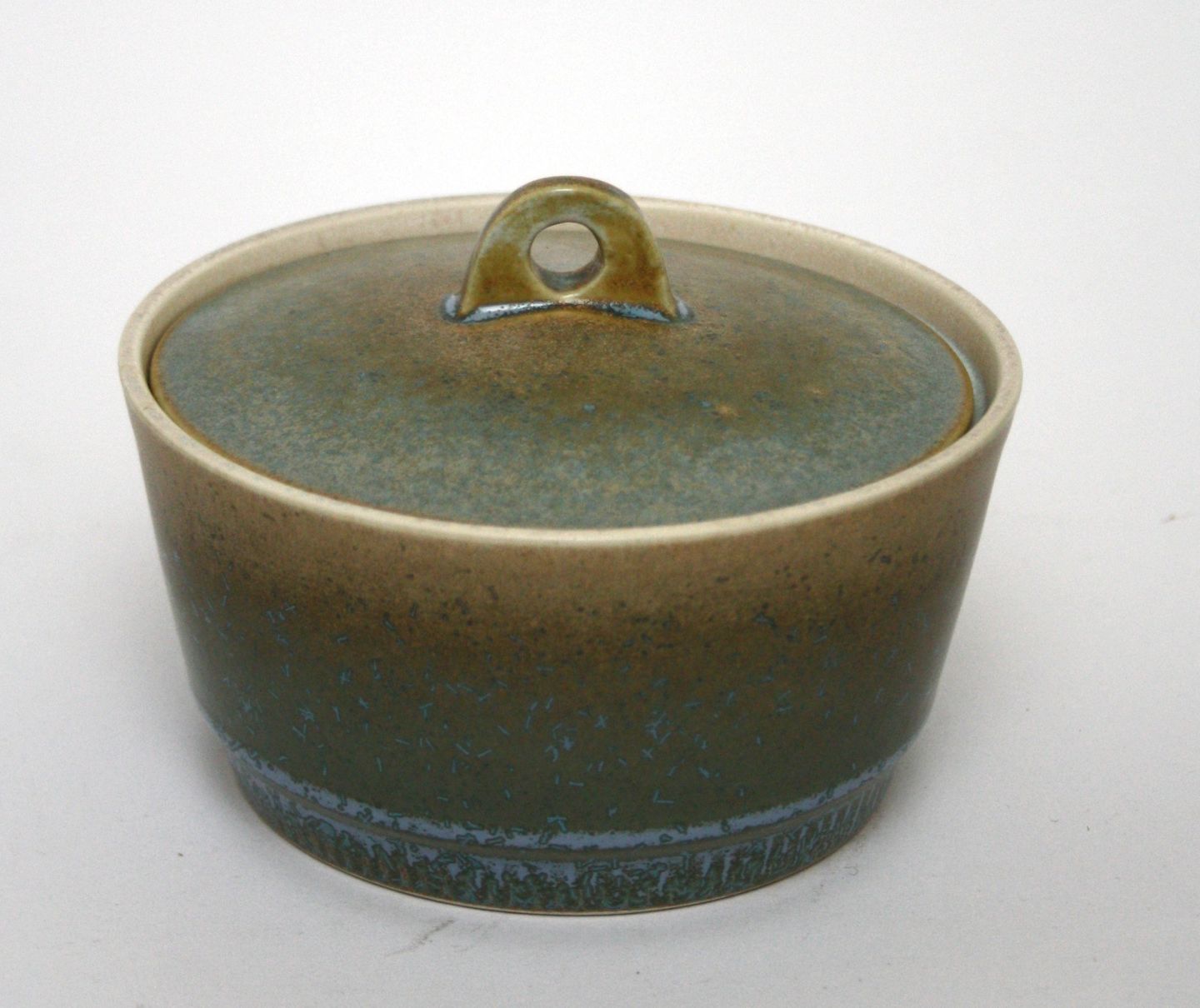 Knabstrup, Knabstrupstellet i azurfarvet glasur. Sukkerskål med låg, stor. Diameter 13 cm. Højde uden låg 6,5 cm. Pris: SOLGT
