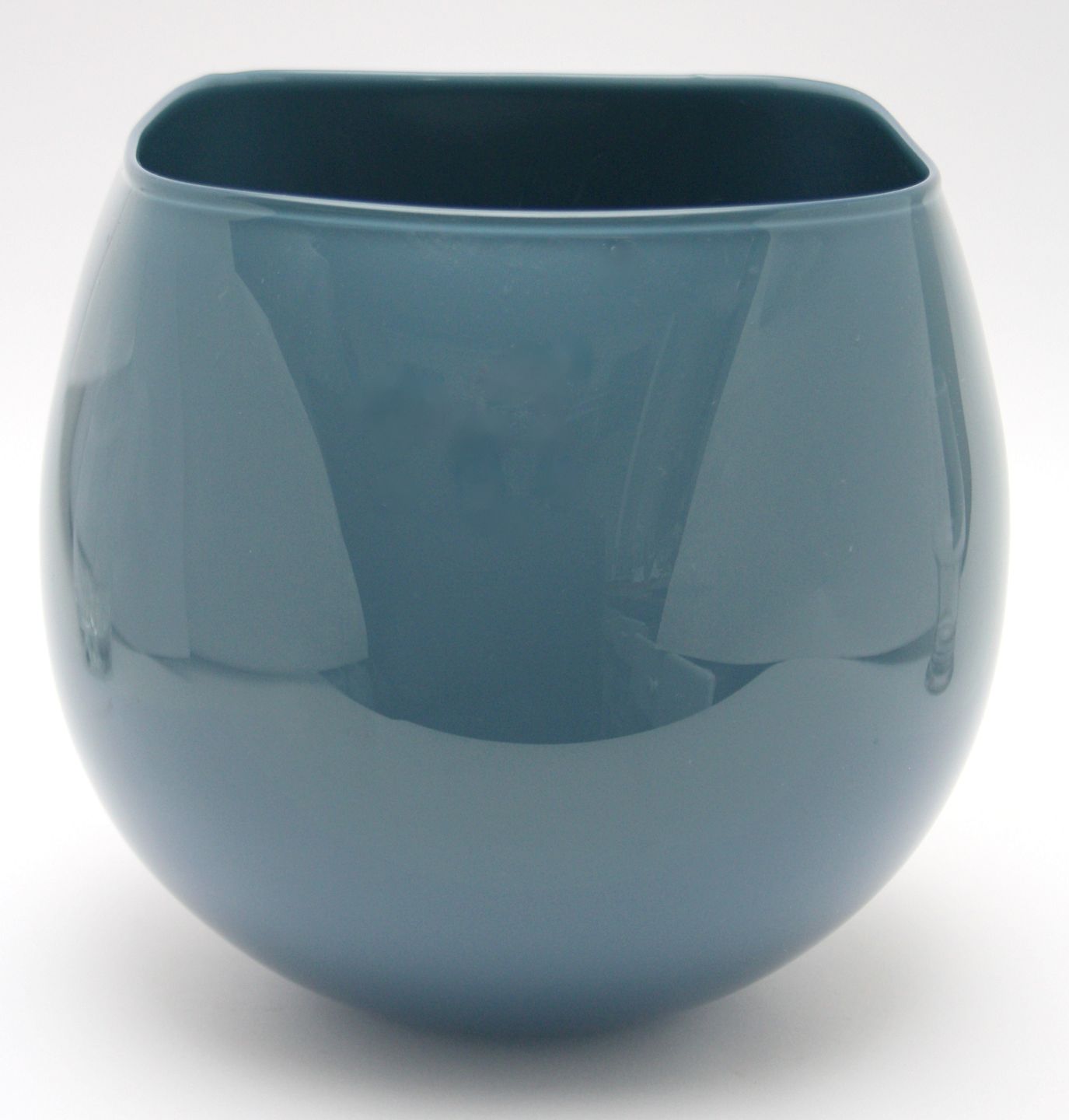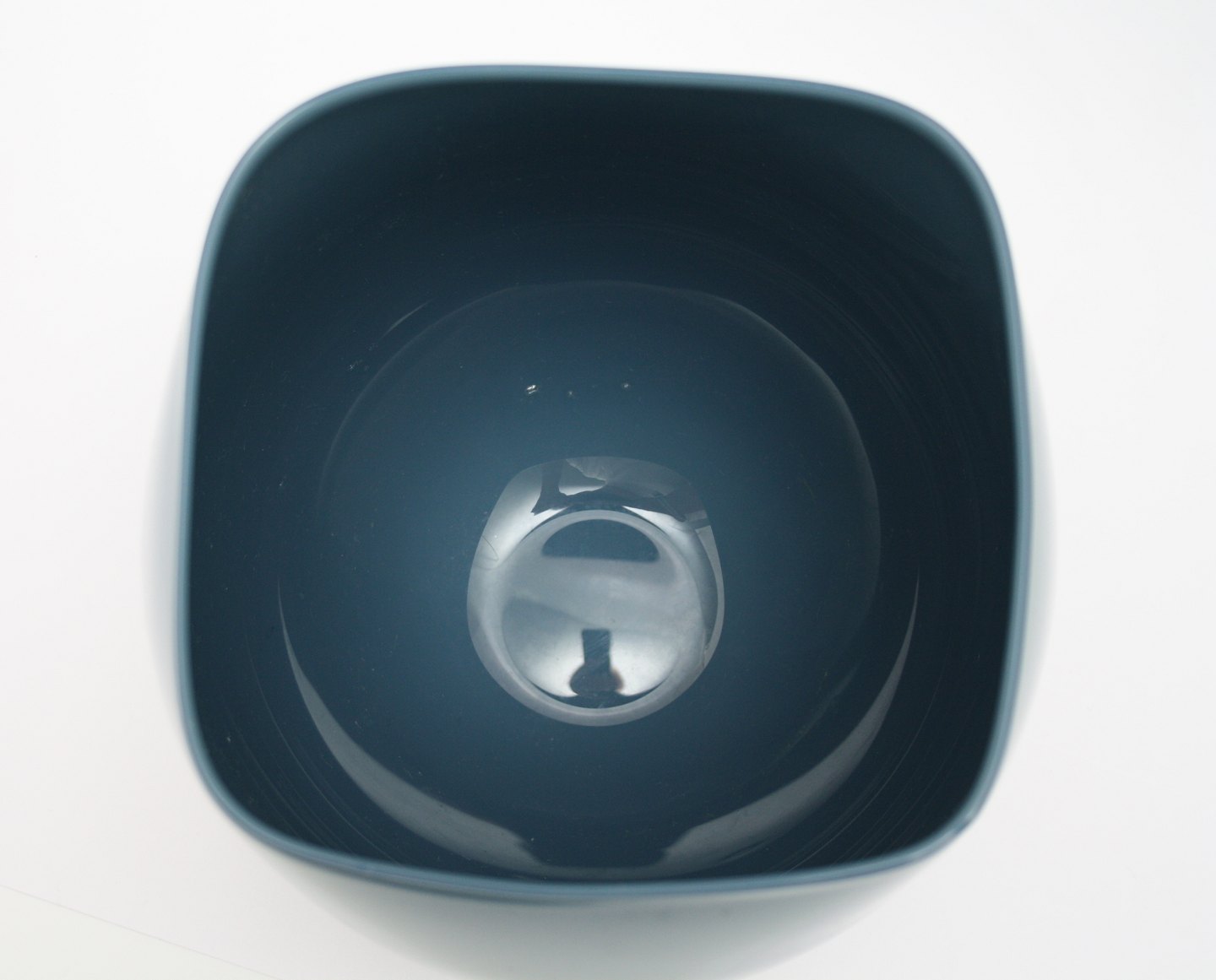 Holmegaard, Quadro Art glass. Stor Gråblå skål med firkantet top og kugleformet bund. Designet af Peter Svarrer i 2003. Quadro er en brugskunst serie i forskellige former og farver, der starter i 1998 og udgår af produktion i 2004. Skålen var dyr at fremstille pga. den firkantede top kombineret med den runde bund. Højde 17 cm. Diameter 16 cm. II sortering. Pris: SOLGT