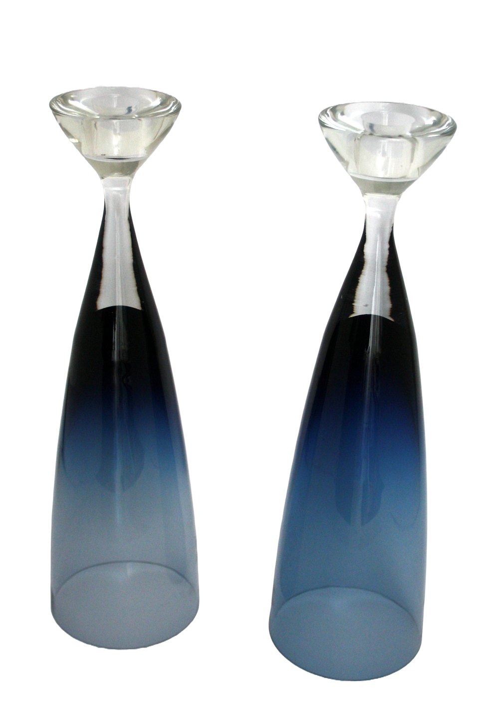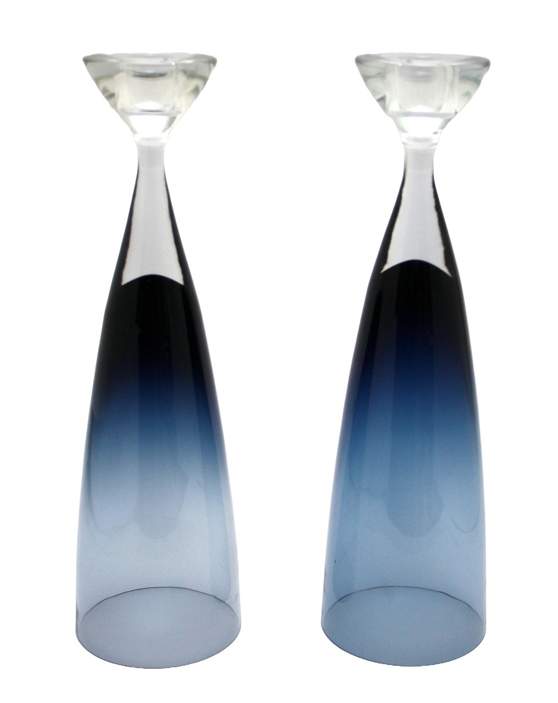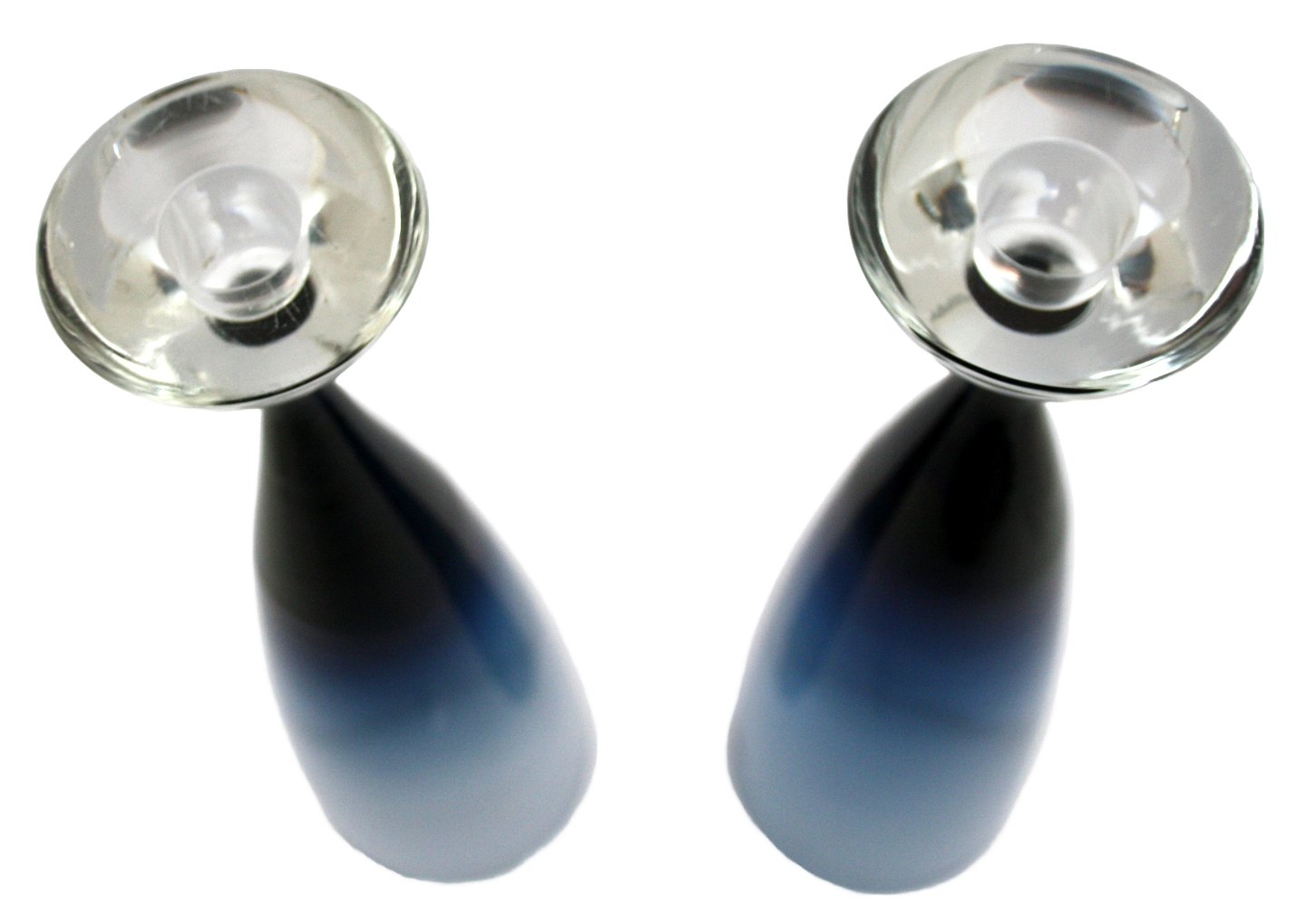 Kastrup Glasværk, Lysestager i blæst klar glas med blå underdel. Kan vendes og bruges som vaser. Designet af Bent Severin i 1960. Højde 32 cm. Brugsslid på den ene foroven. Sælges samlet som sæt. Pris: SOLGT