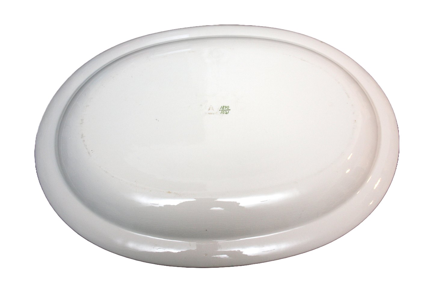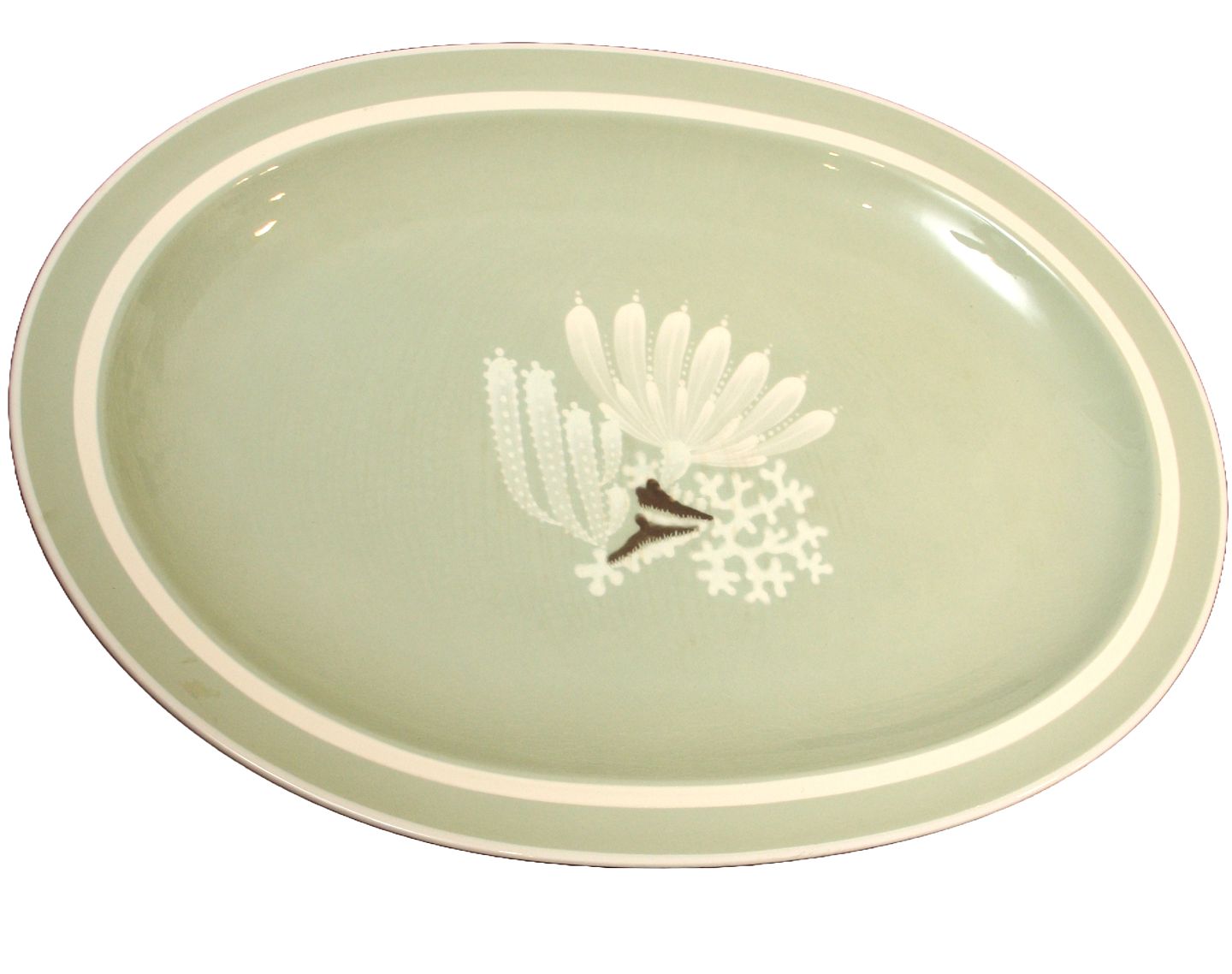 Aluminia, Gefion, Kæmpe stegefad nr.1890/1621. Stellet er støvgrønt med hvide kanter og koralrev motiver. Designet af Niels Thorsson i 1937. Længde 52,5 cm. Bredde 37 cm. Overfladekrakeleringer. Pris: SOLGT