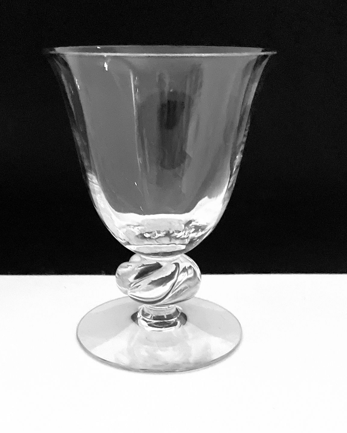 Holmegaard, Ulfborg, Rødvin krystalglas med optisk stribet kumme og stærkt vredet stilk. Designet af Jacob E Bang i 1937. Udgår af produktion omkring 1970. Højde 12 cm. Diameter 8,5 cm. Pris: SOLGT