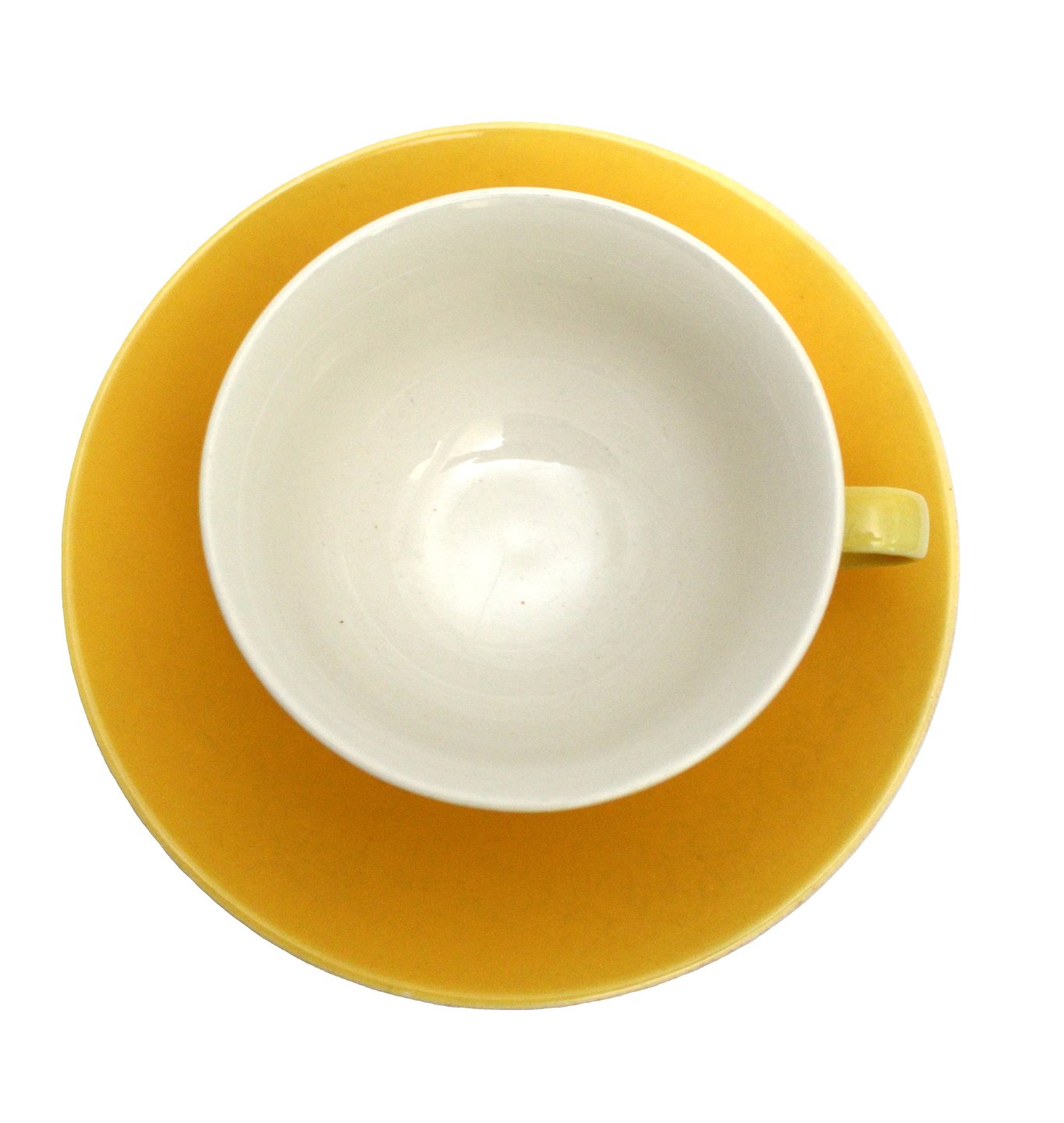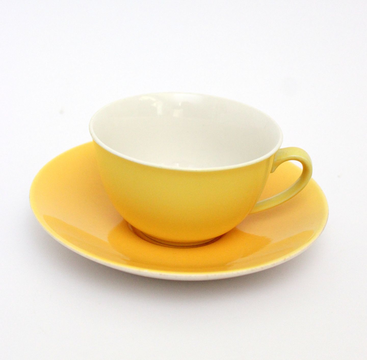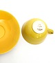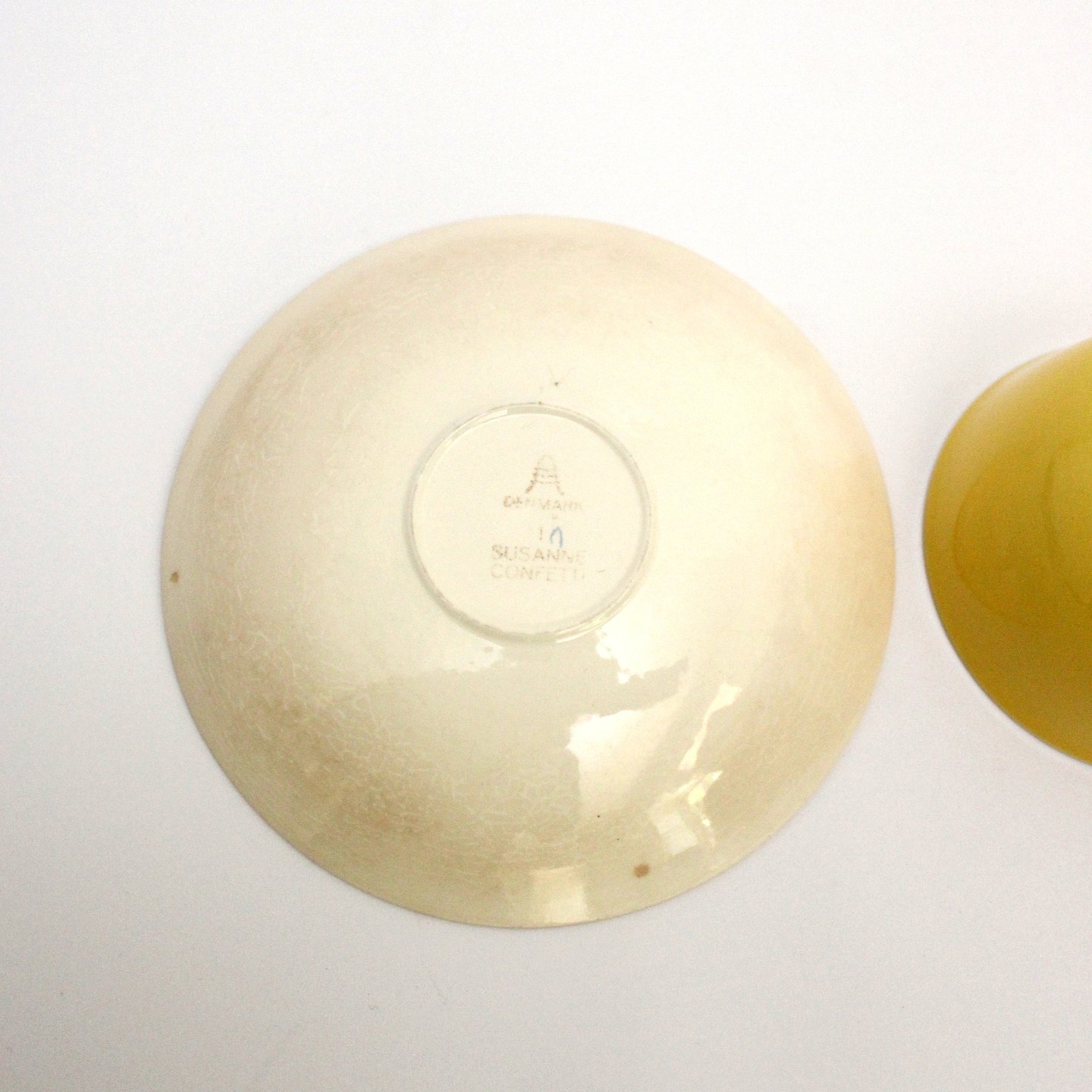 Aluminia, Susanne, Confetti, Gul morgenkop med underkop. Kop diameter 9,5 cm. Højde 5,5 cm. Underkop diameter 15,5 cm. Flot stand med lette overfladekrakeleringer. Pris: solgt