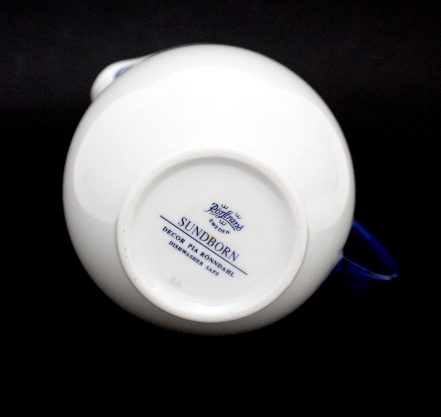 Rørstrand, Sundborn, dishwasher safe porcelæn. Dekoreret af Pia Rönndahl. Fra det oprindelige Rørstrand, da de stadig producerede i Sverige. Mælkekande. Højde 14 cm. Øverste diameter 10 cm. Længde 16 cm. Pris: 250 kr. stk. Lager: 1