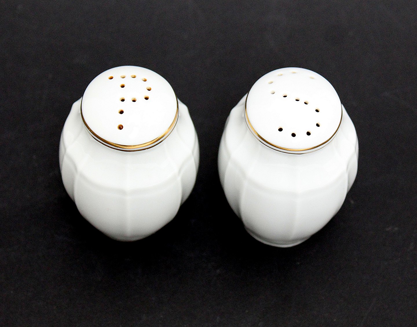 Bing & Grøndahl, Offenbach, Salt og Peber sæt. Hvidt kantet porcelæn med guld. Højde 7,5 cm. Salt og peber med original B&G propper. Pris: 375 kr. for sættet.