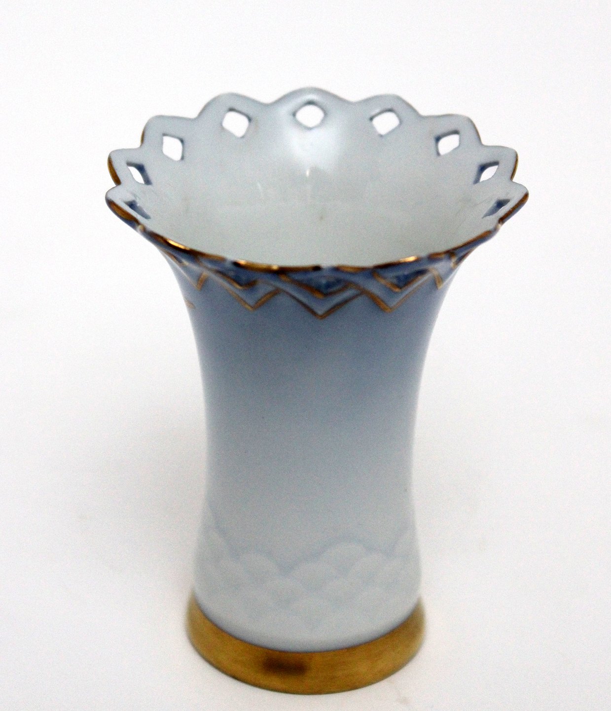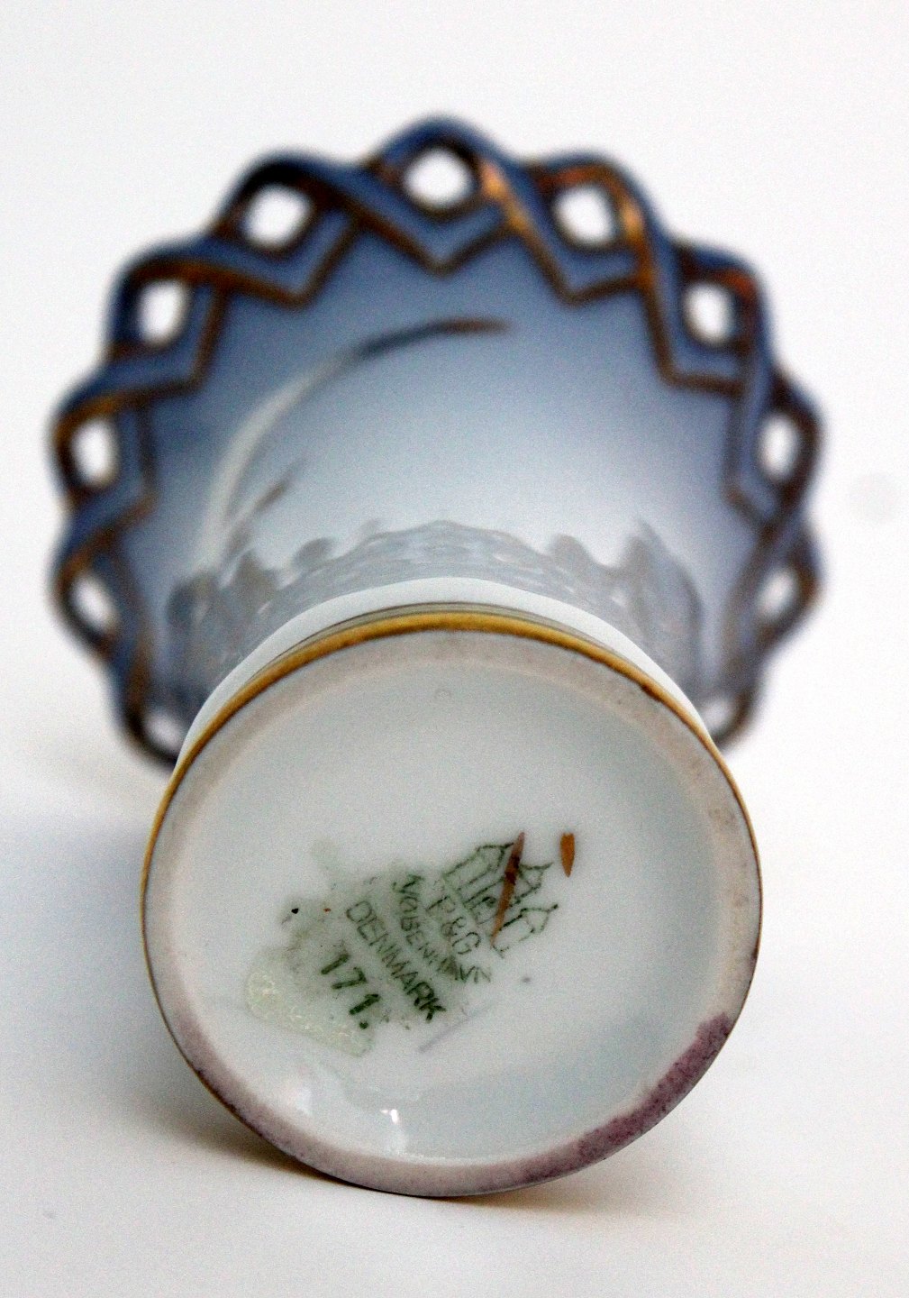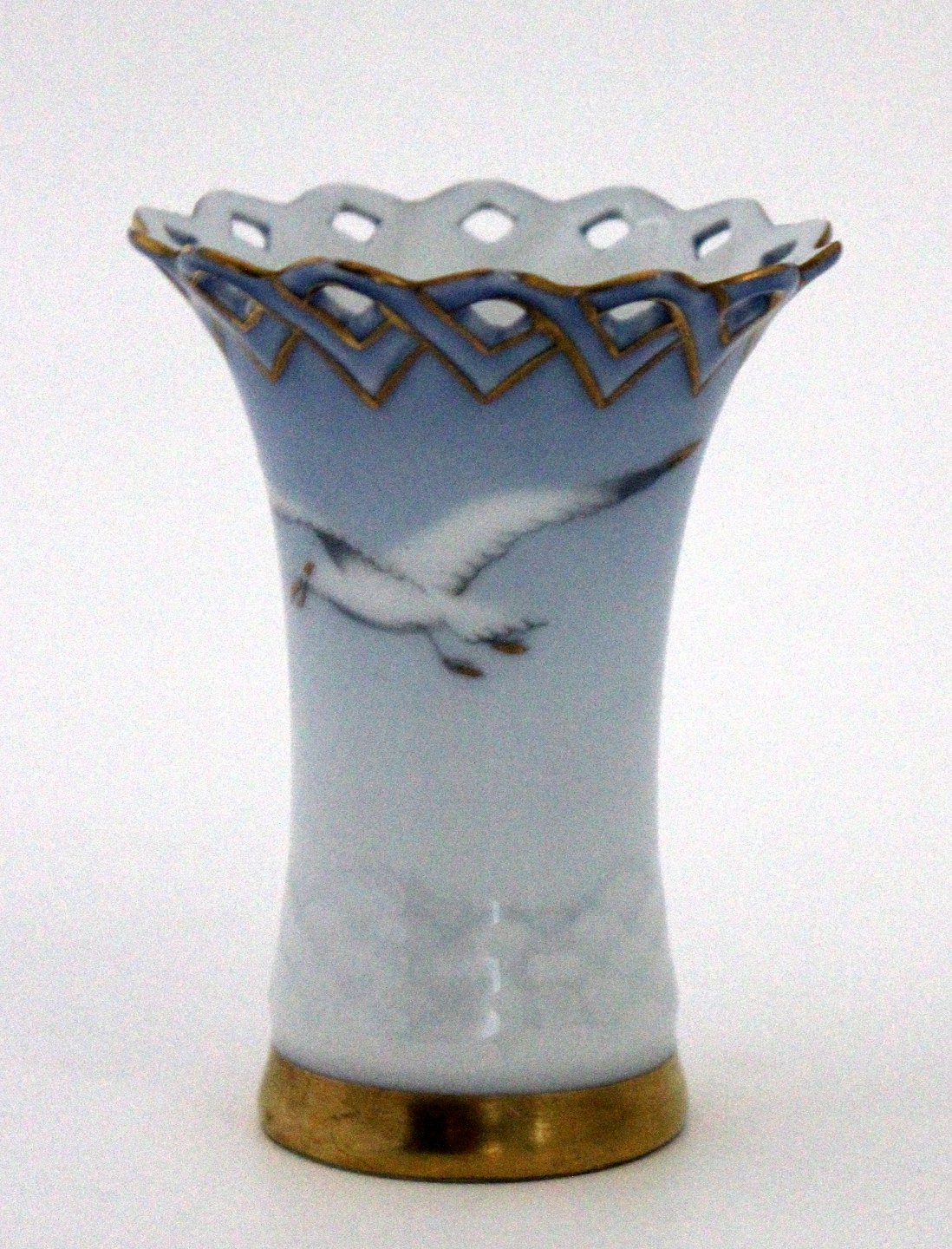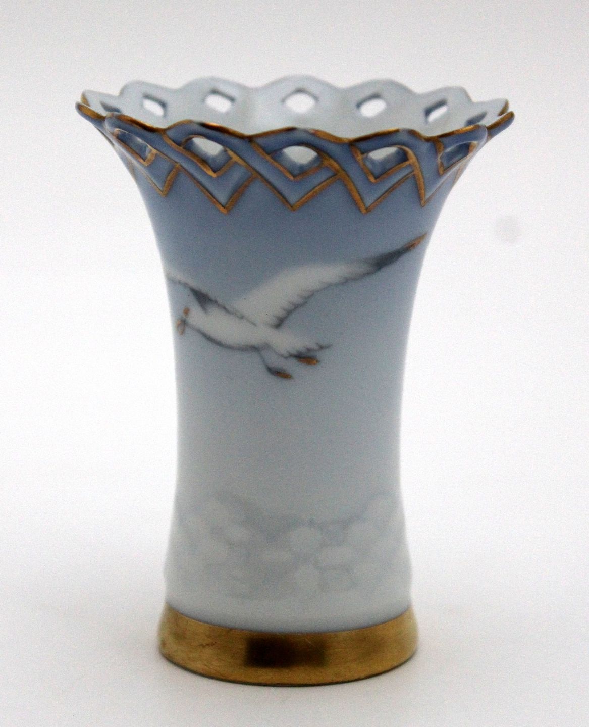 Bing & Grøndahl, Måge med guld, Kuvertvase med hulkant. Nr. 171. Højde 7,5 cm. Øverste diameter 6 cm. I. sortering. Pris: SOLGT