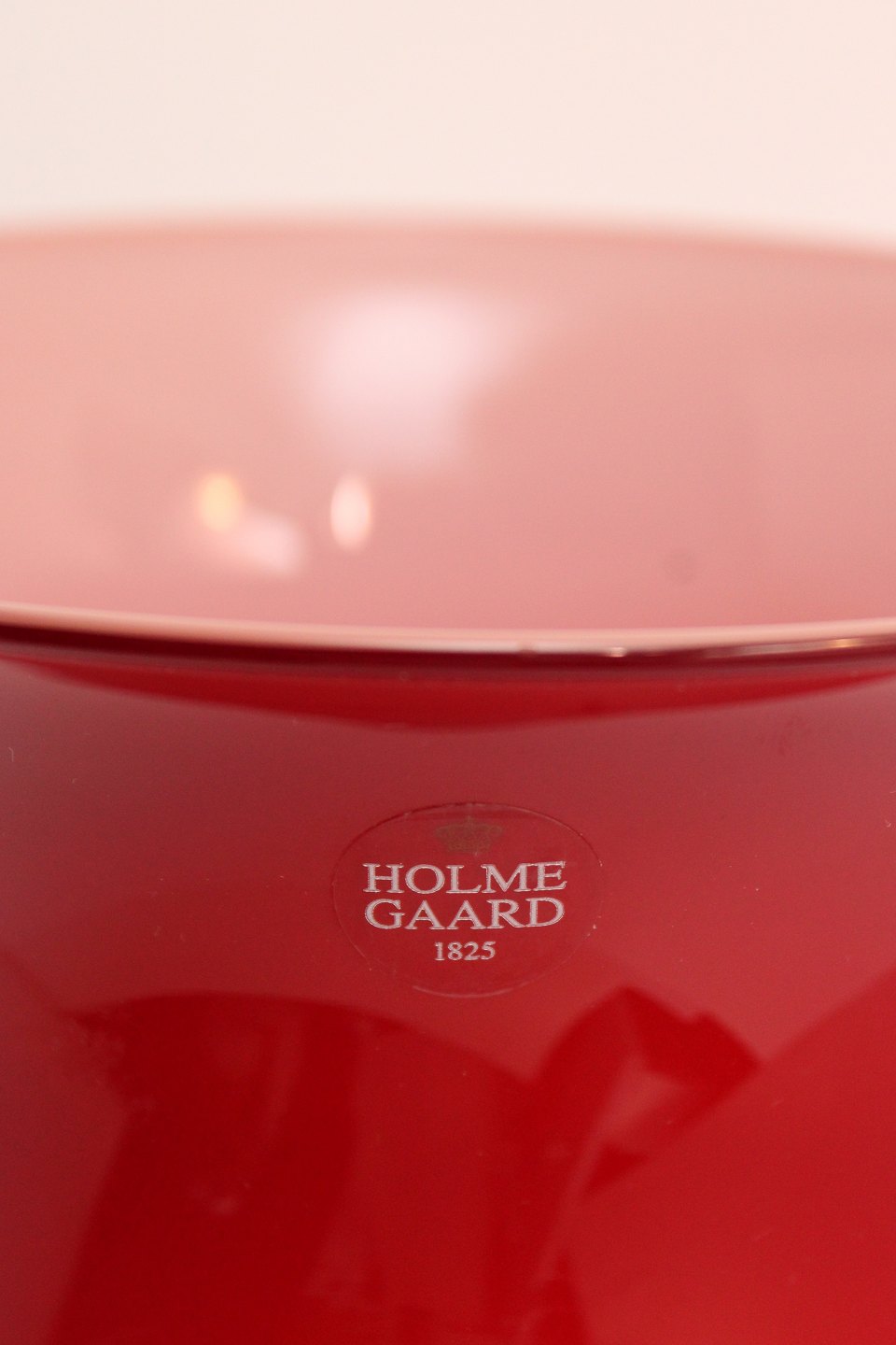 Holmegaard, Karen Blixen, Stor bordeaux rød vase støvet rosa indvendig. Designet af Anja Kjær fra 2000. Vasens form er inspireret af afrikanske kvinders hals og armringe. Højde 31 cm. Diameter 17 cm. Holmegaard label. Fin stand. Pris: 550 kr. stk. Lager: 1