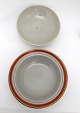 Aluminia, Tureby, grå fajance med orange fane samt guldkant. Designet af Nils Thorsson 1934-1968. Lågskål eller kompotskål, sjælden. Diameter 21 cm. Højde uden låg 4 cm. Med låg 11 cm. Fin stand. Pris: 350 kr. stk. Lager: 1