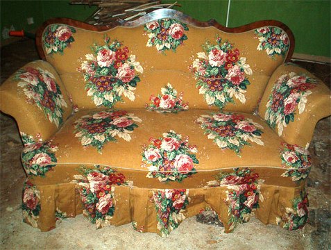 2 personers sofa fra 1800 tallet. Ny blomstret ombetrækning med flæser. Ingen betræk på bagsiden. Pris: SOLGT