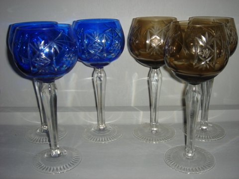 3 blå og 3 røgfarvet Rømerglas alle i samme mønster, højde 19 cm. de 3 blå er solgt,