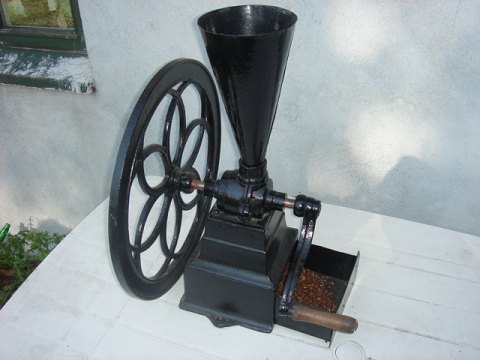 Gammel Kaffemølle fra Holstebro. Er du til grovmalet kaffe, så er denne velfungerende kafemølle sagen. Højde 57 cm. Bredde fra træhåndtag til hjul 40 cm. Hjul diameter 47 cm. Tragt diameter 15 cm. Tragt højde 30 cm. Sendes ikke med post.