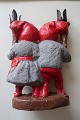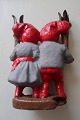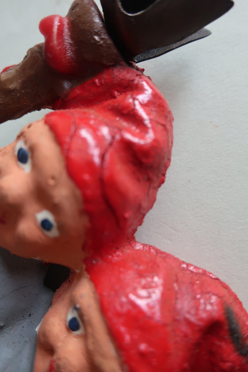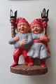 2 gamle lysestager i form af nissefar og nissemor med lysetager som fakler (lavet af metal)
